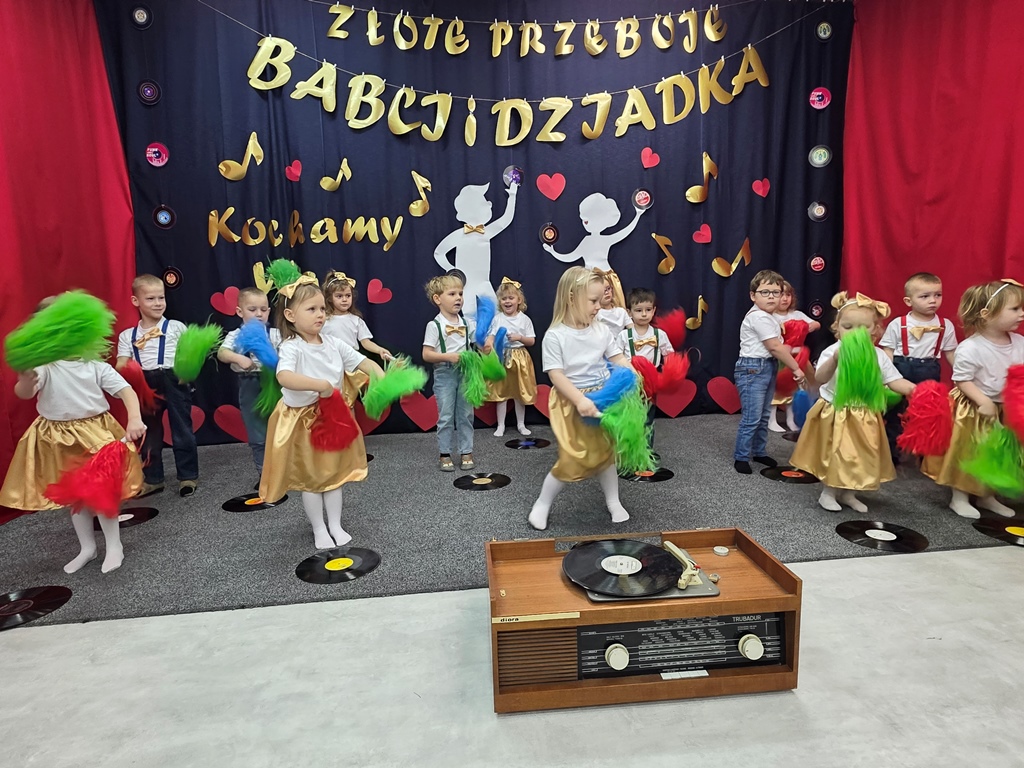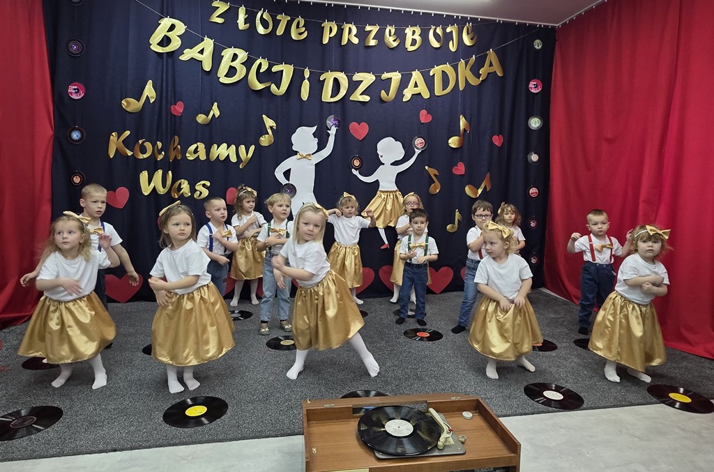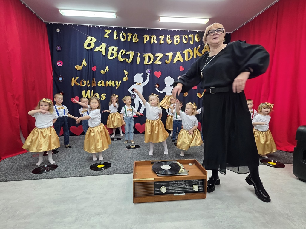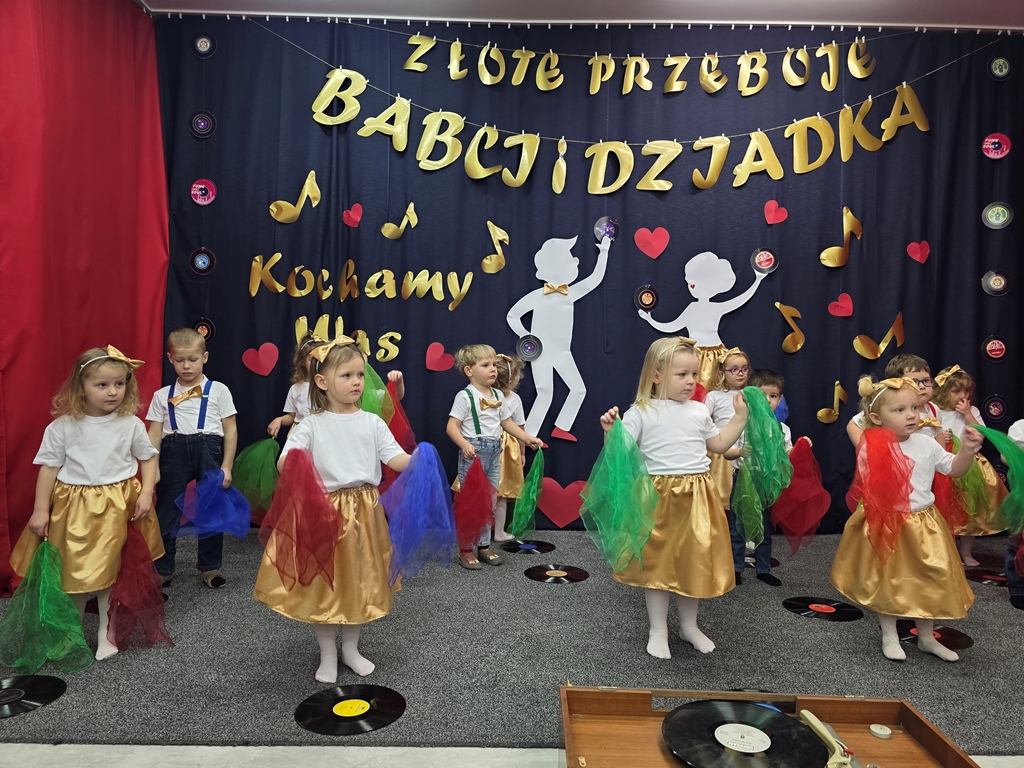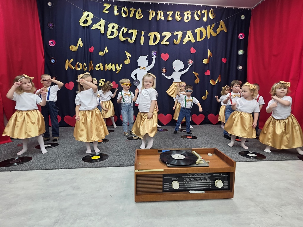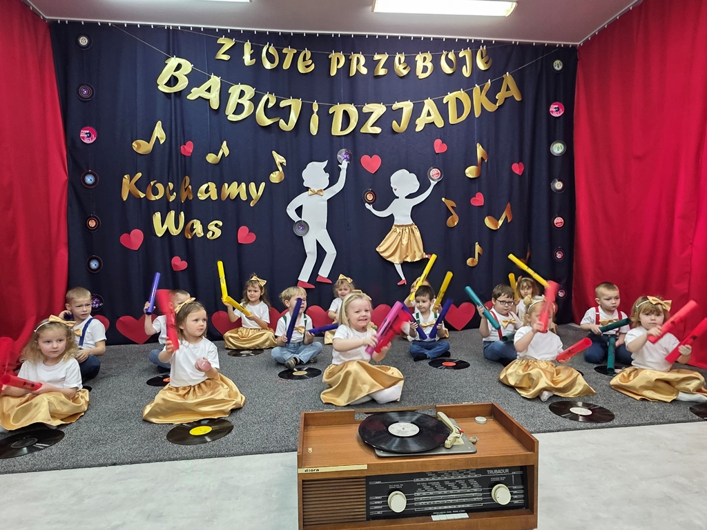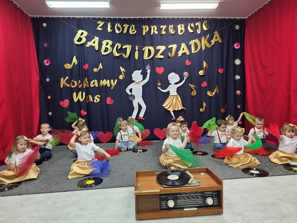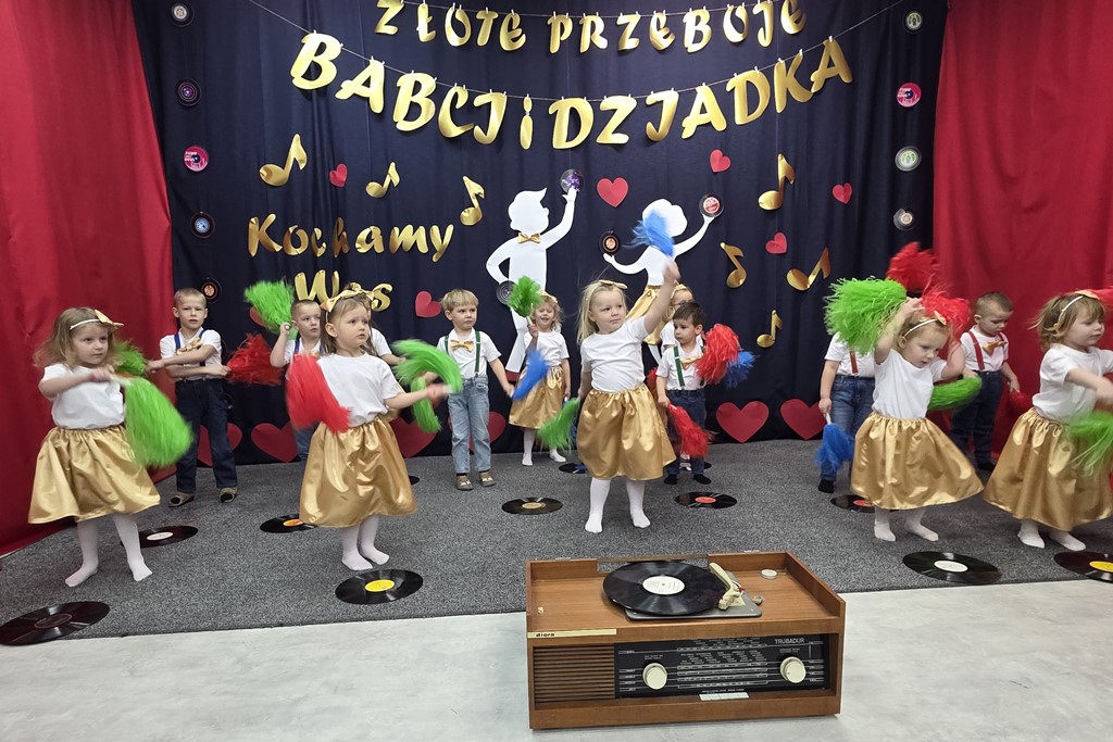 23 srtcznia dzieci z najmłodszej grupy – Sówki zaprezentowały swoim Babciom i Dziadkom wyjątkowy program artystyczny pod hasłem „Złote przeboje Babci i Dziadka”.