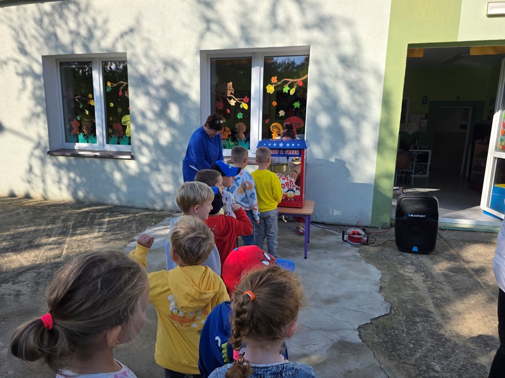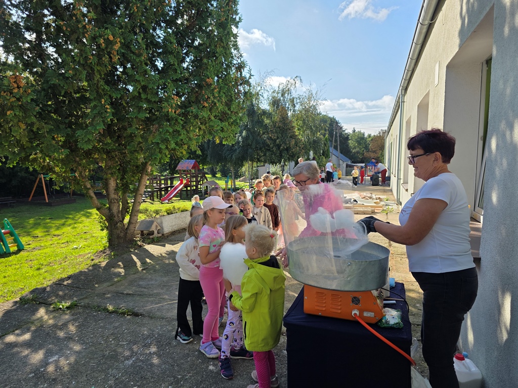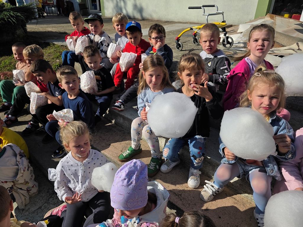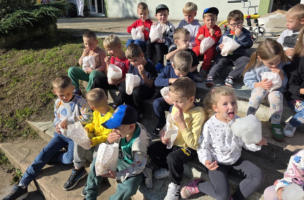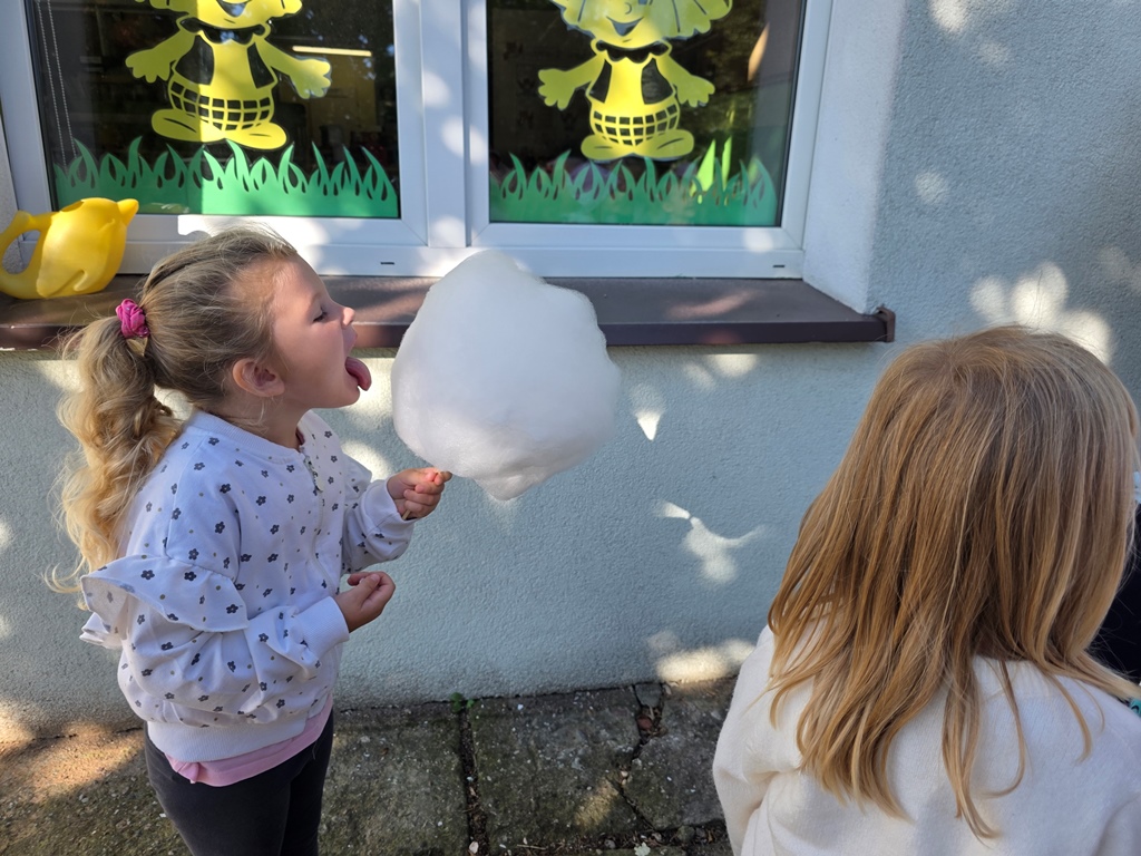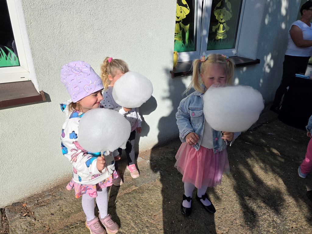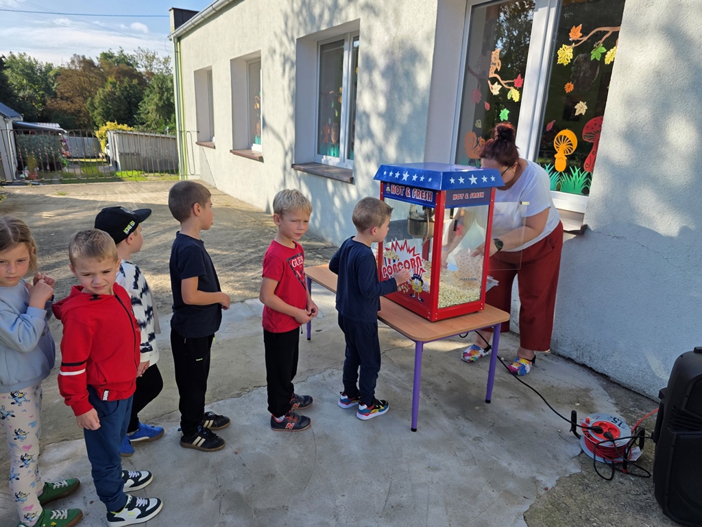Po części w sali przedszkolnej dzieci zostały zaproszone na plac zabaw, gdzie czekała na nie słodka wata cukrowa oraz pyszny, gorący popcorn. Całości towarzyszyła dobra muzyka, a na twarzach przedszkolaków gościł radosny uśmiech.