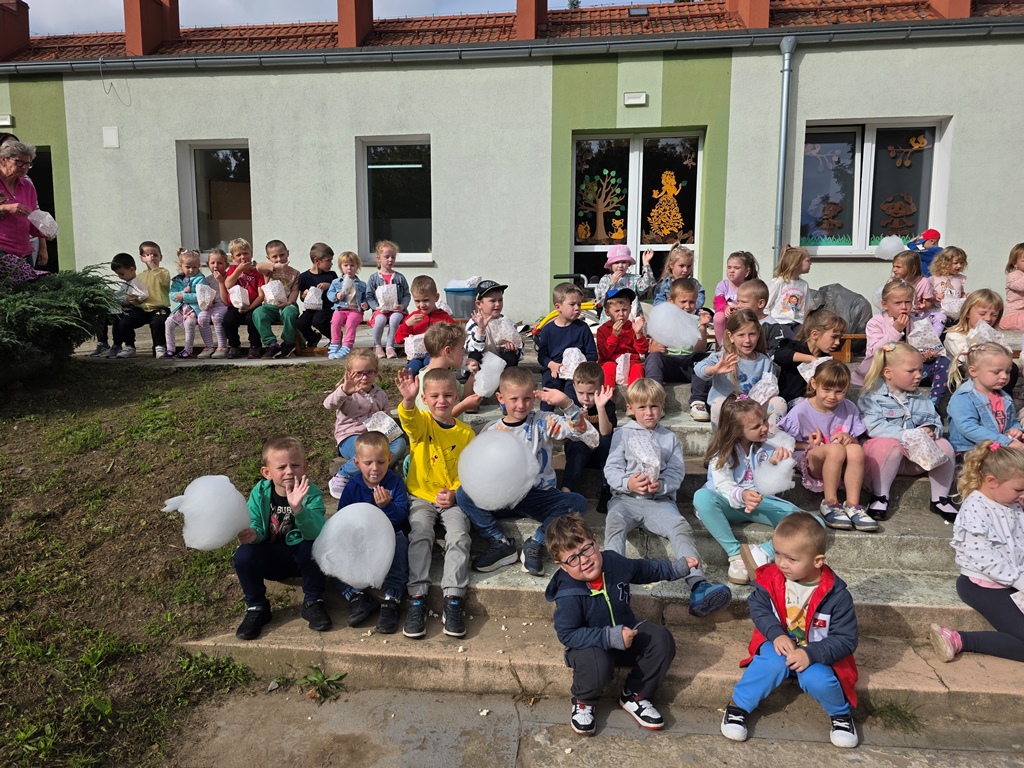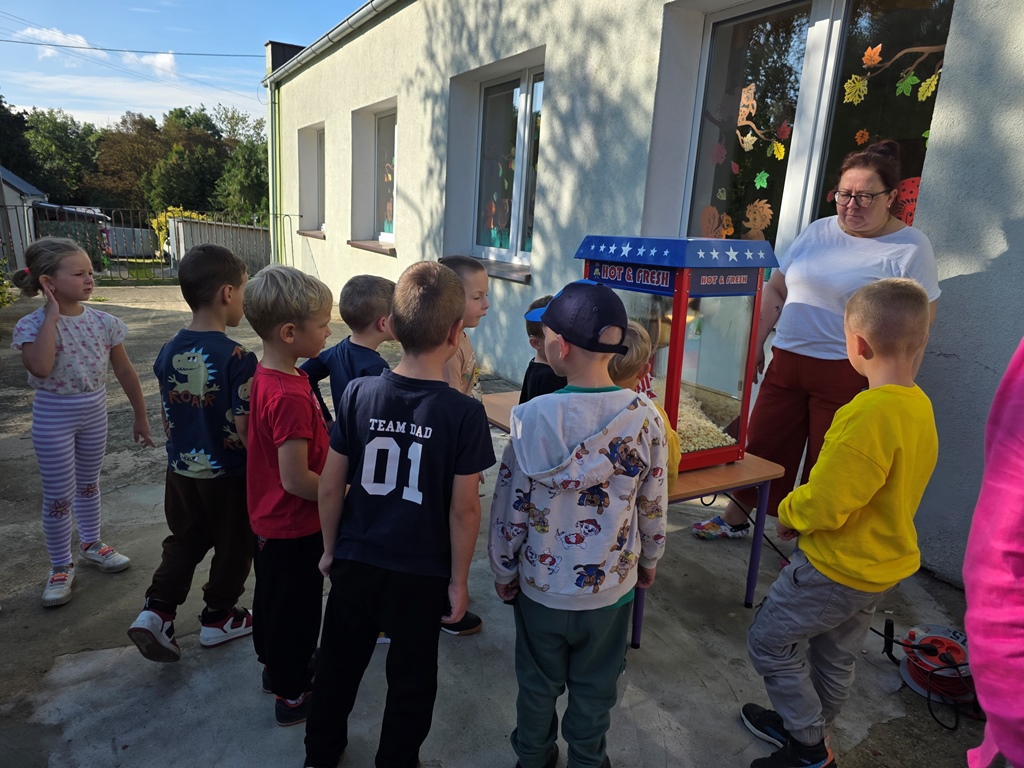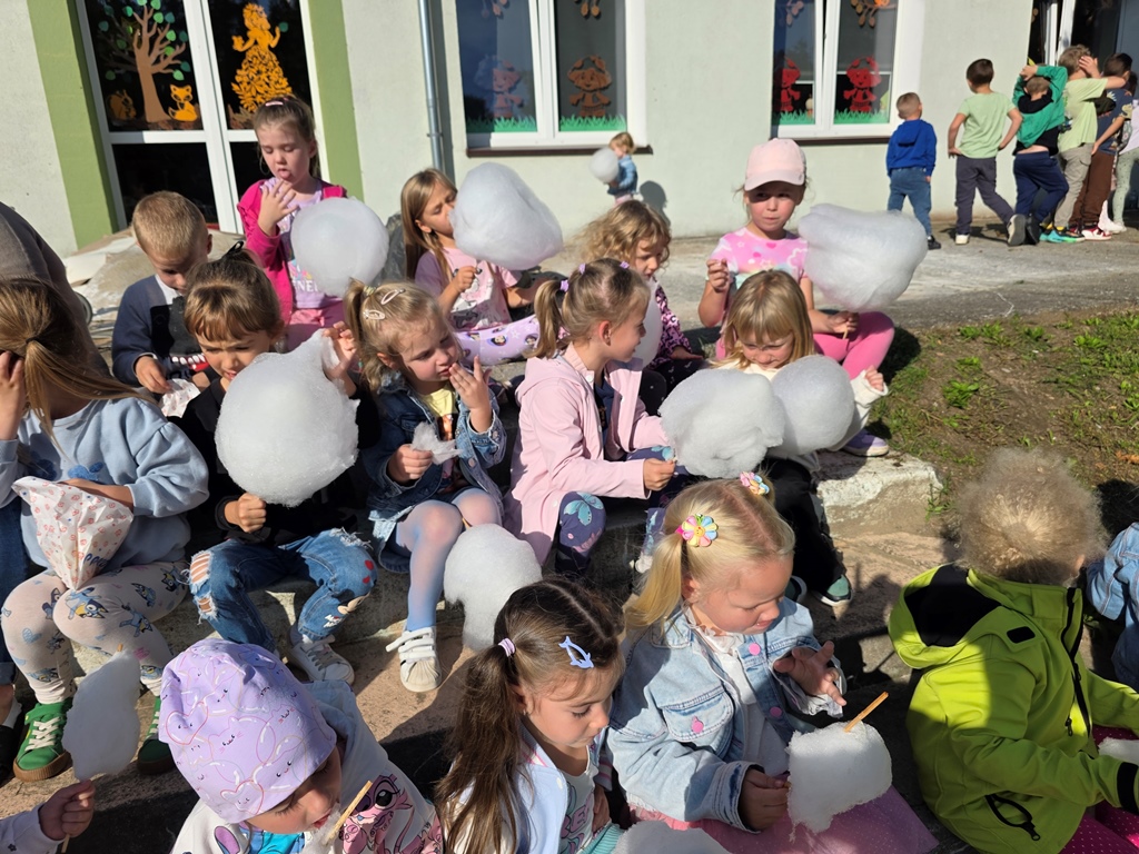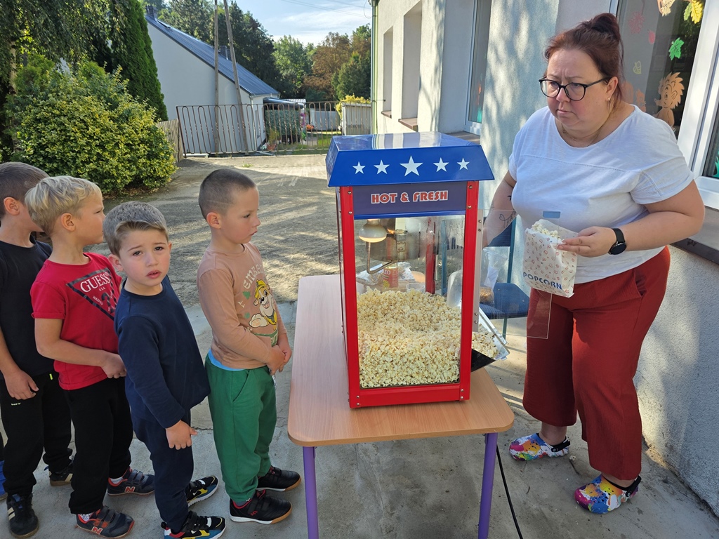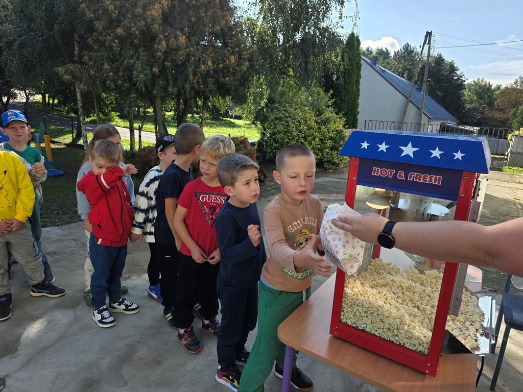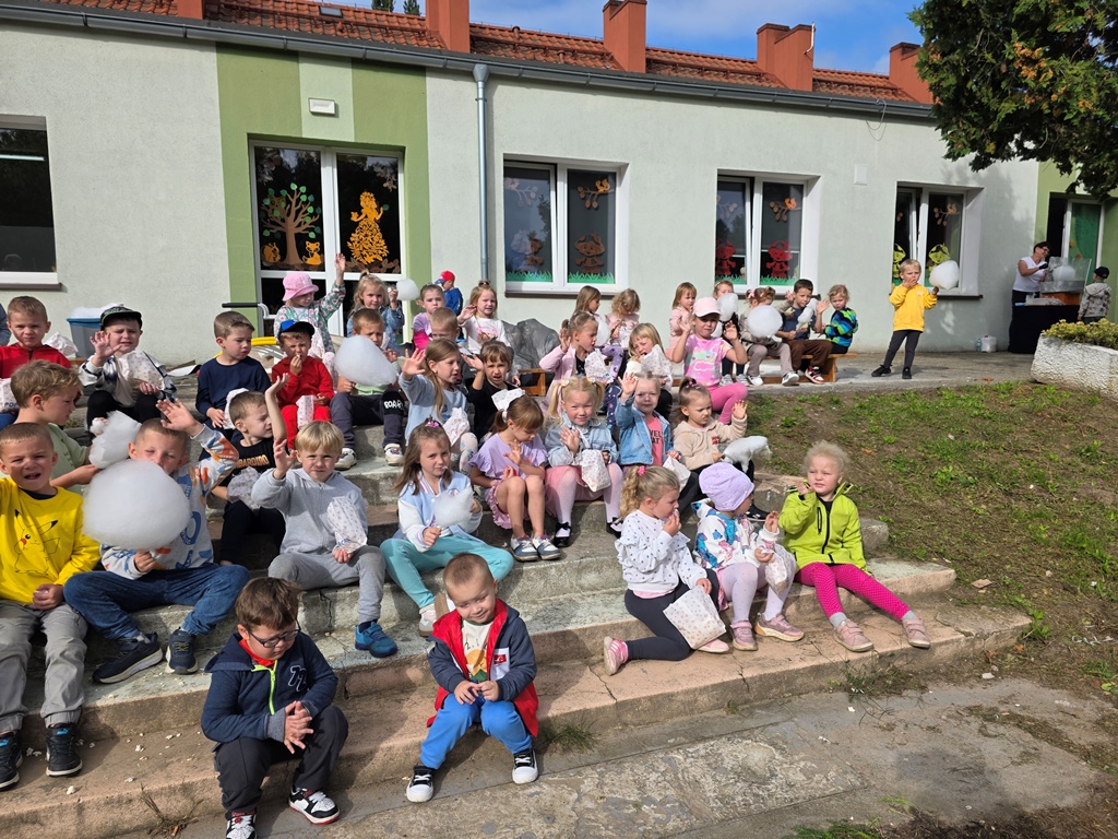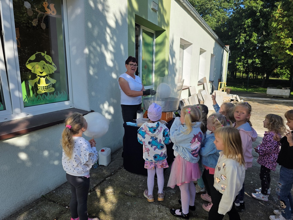 Po części w sali przedszkolnej dzieci zostały zaproszone na plac zabaw, gdzie czekała na nie słodka wata cukrowa oraz pyszny, gorący popcorn. Całości towarzyszyła dobra muzyka, a na twarzach przedszkolaków gościł radosny uśmiech.