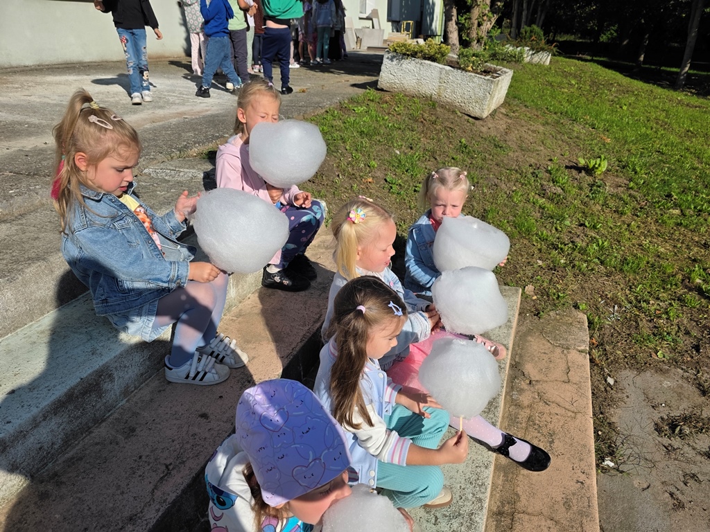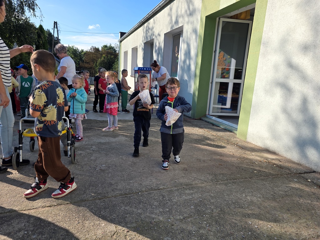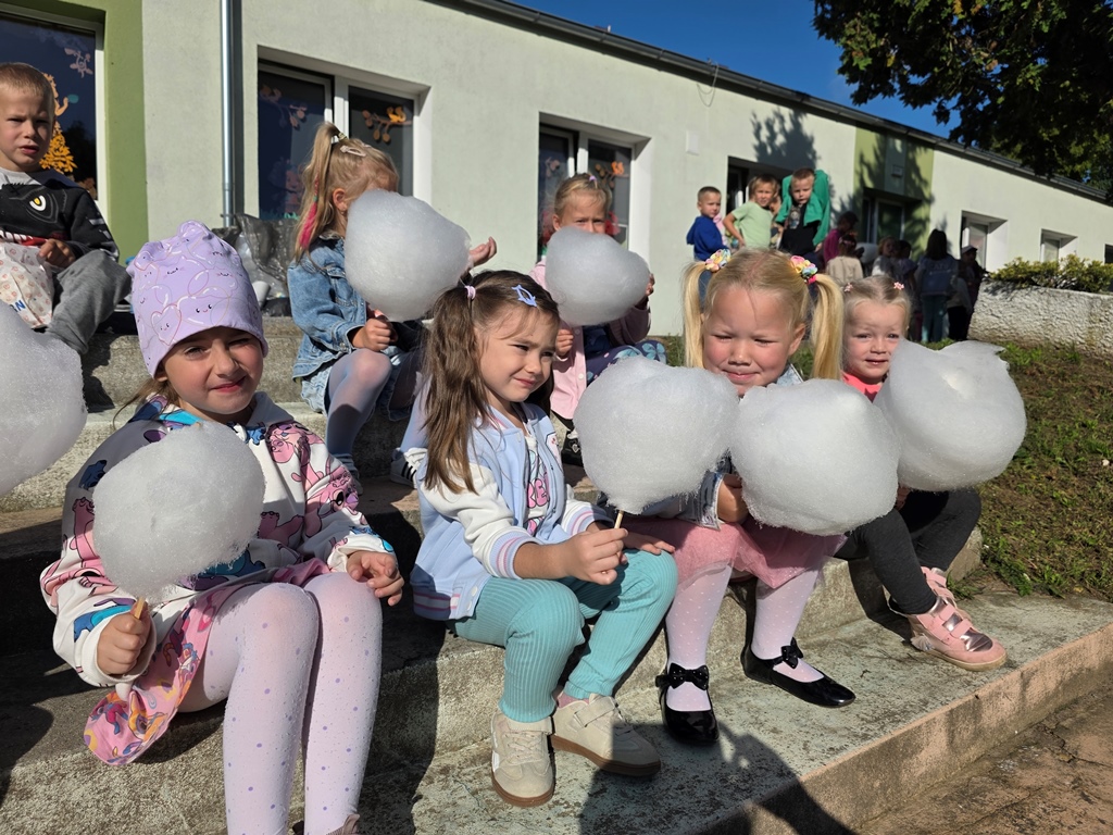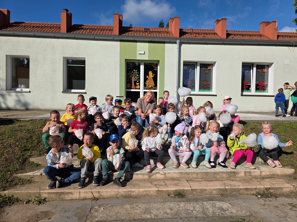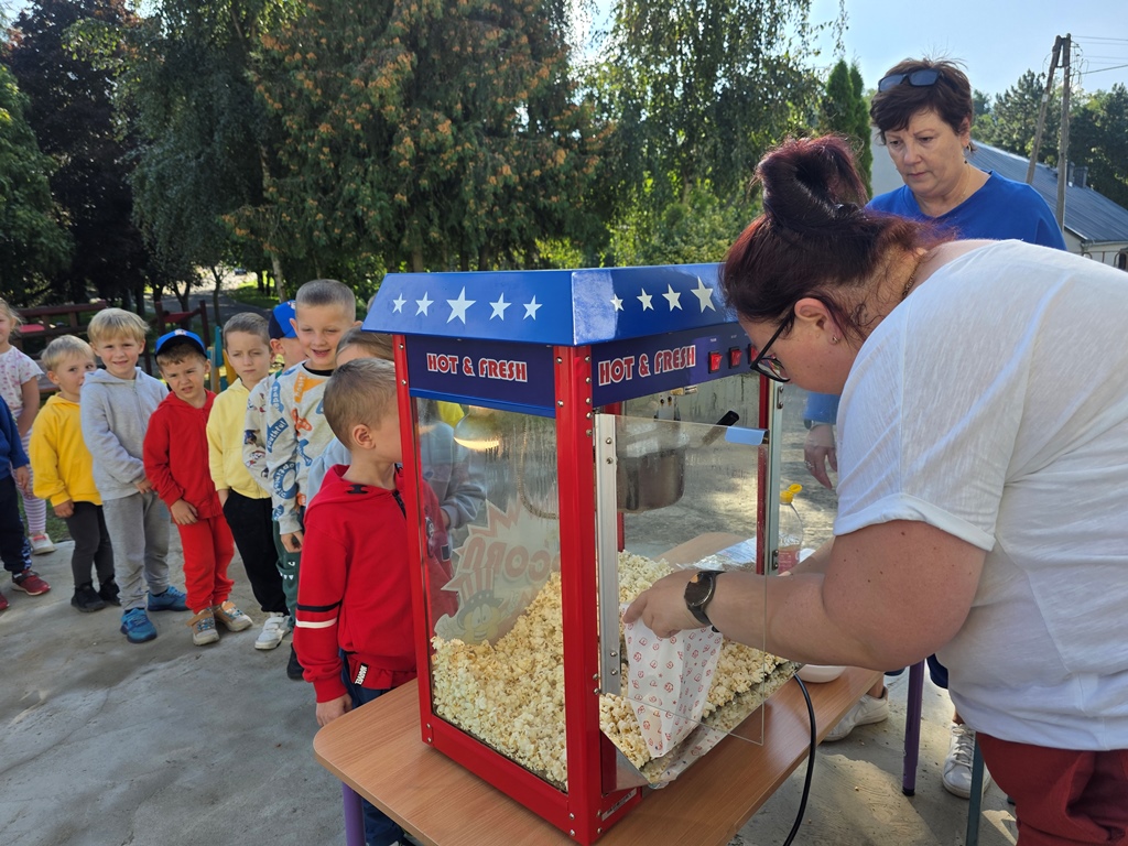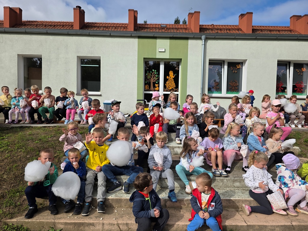 Po części w sali przedszkolnej dzieci zostały zaproszone na plac zabaw, gdzie czekała na nie słodka wata cukrowa oraz pyszny, gorący popcorn. Całości towarzyszyła dobra muzyka, a na twarzach przedszkolaków gościł radosny uśmiech.