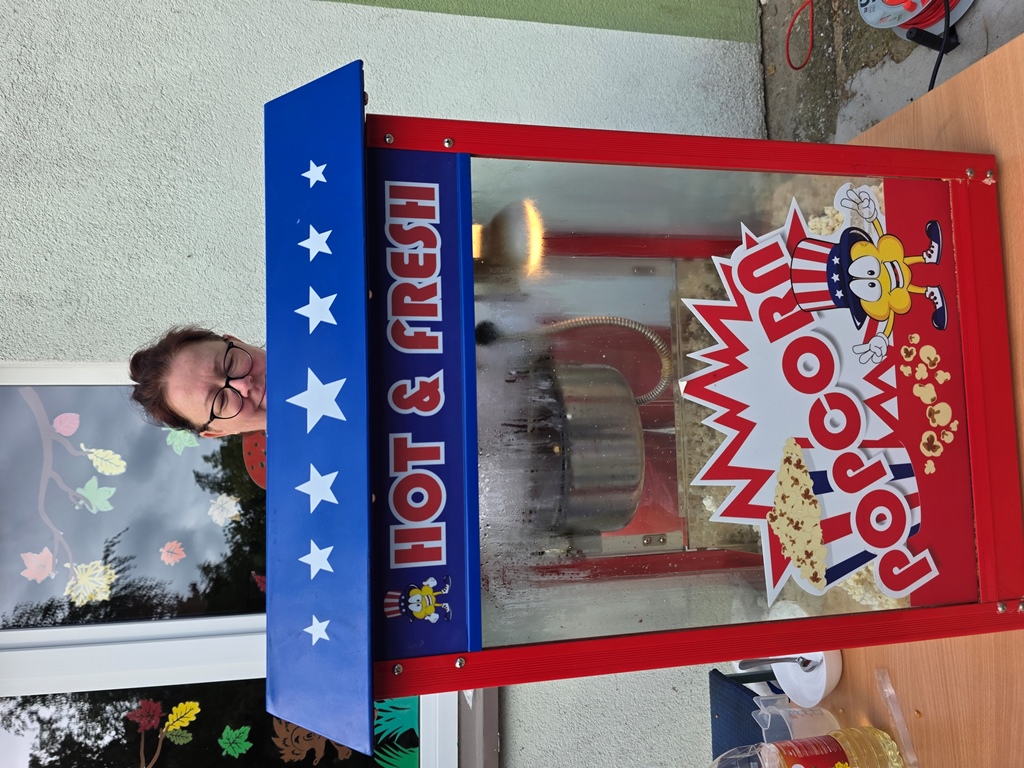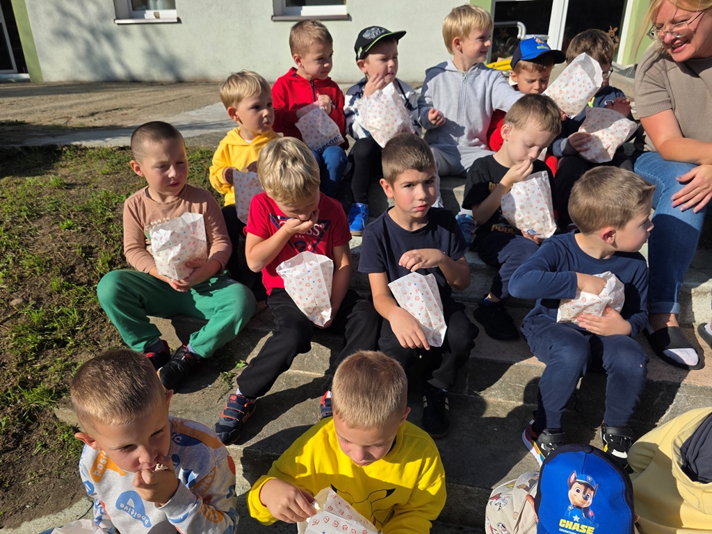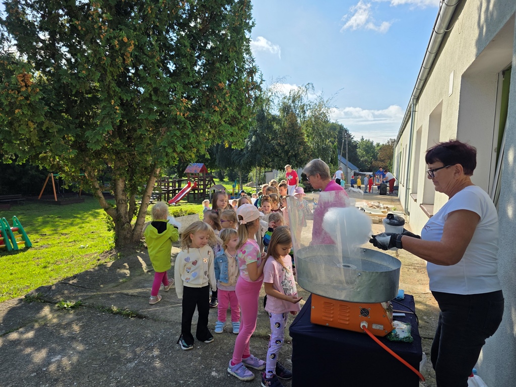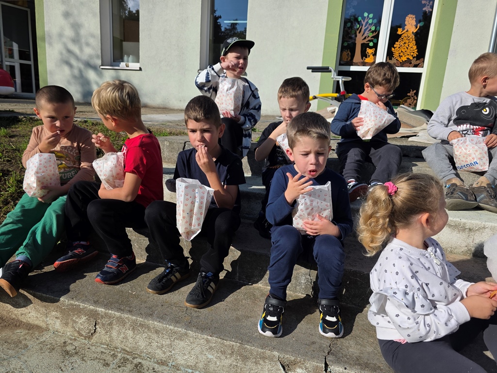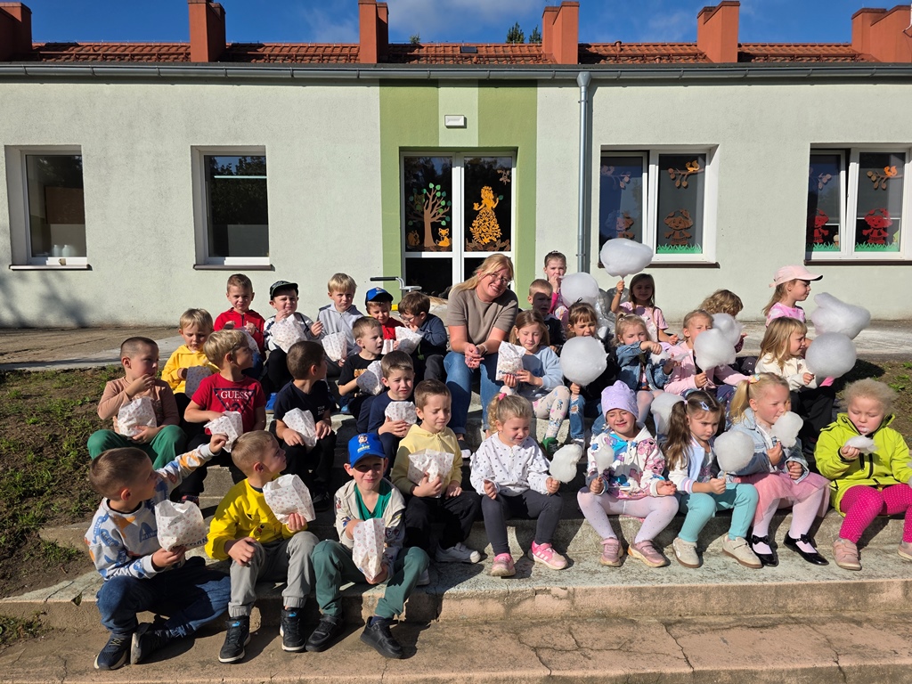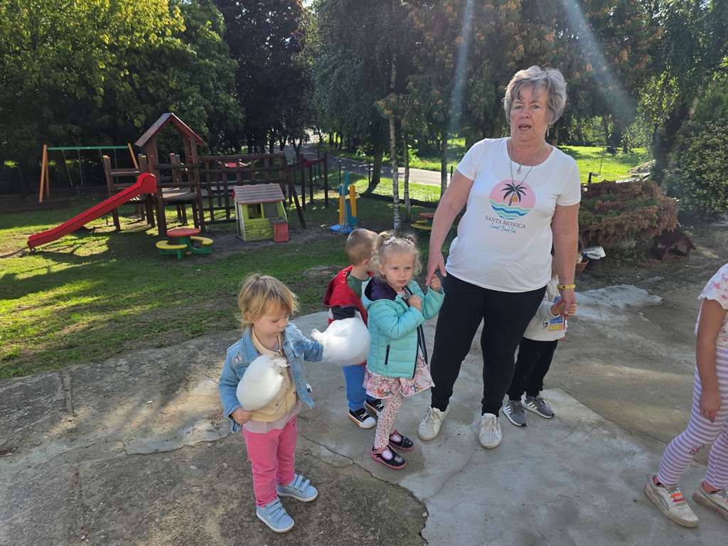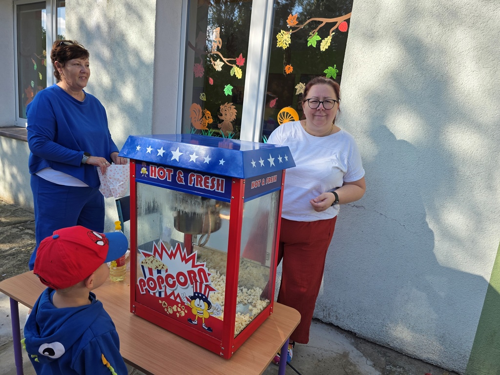 Po części w sali przedszkolnej dzieci zostały zaproszone na plac zabaw, gdzie czekała na nie słodka wata cukrowa oraz pyszny, gorący popcorn. Całości towarzyszyła dobra muzyka, a na twarzach przedszkolaków gościł radosny uśmiech.