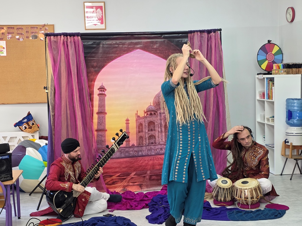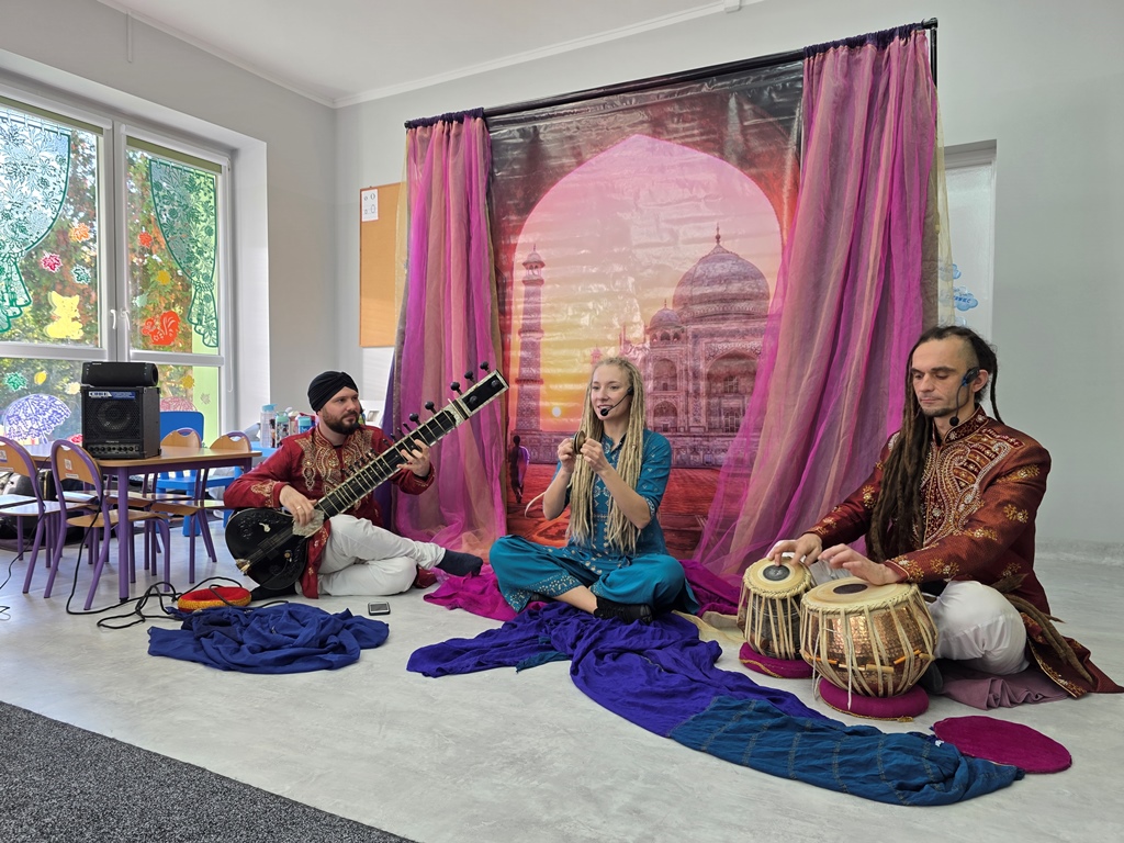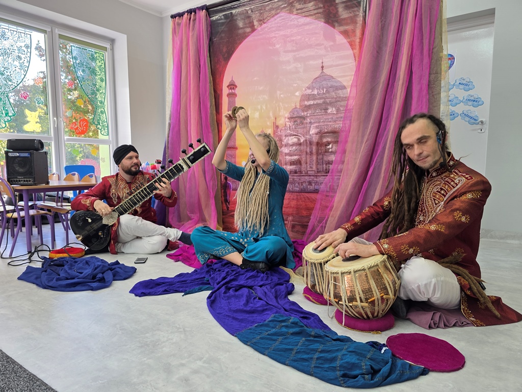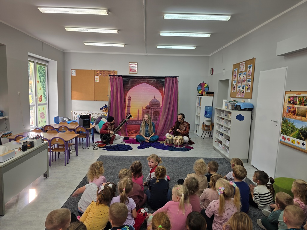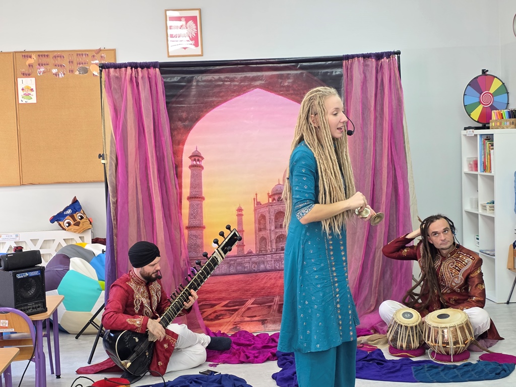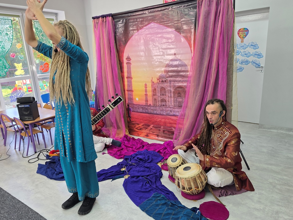 Spotkanie pełne dźwięków, tańca i barw przeniosło nas w zupełnie inny, egzotyczny świat. Mali słuchacze z zaciekawieniem odkrywali bogactwo indyjskiej kultury i świetnie bawili się w rytmie orientalnych melodii.