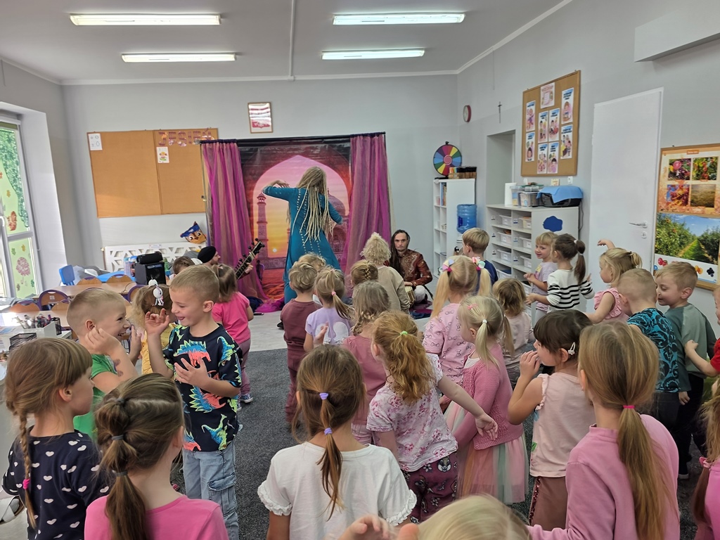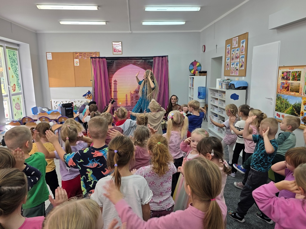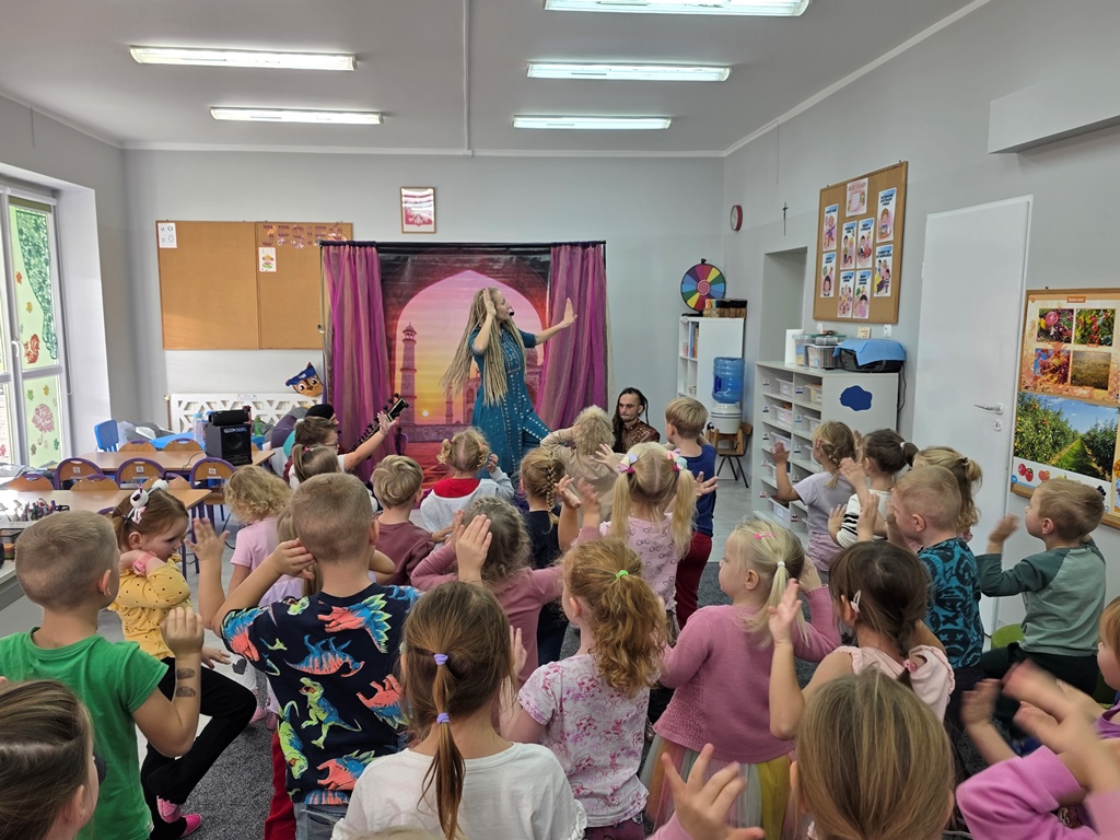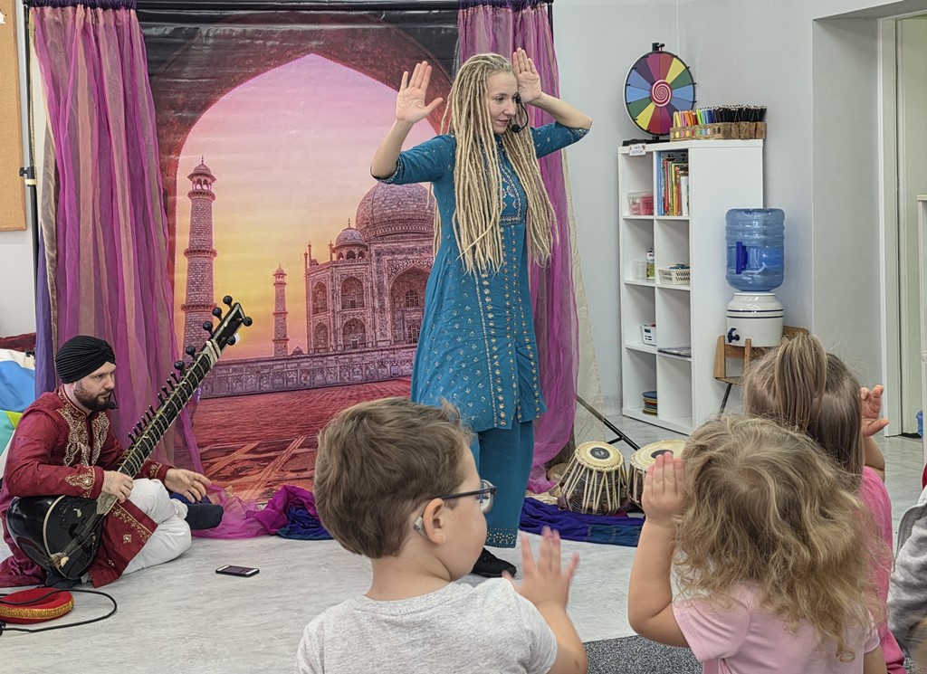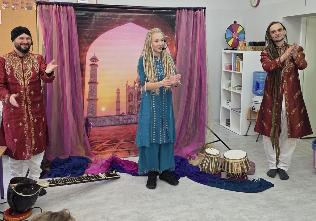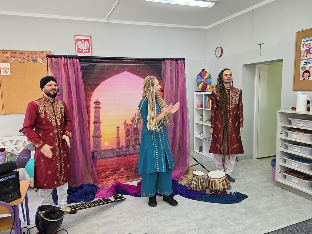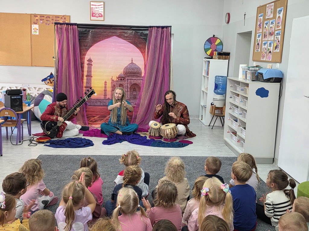Spotkanie pełne dźwięków, tańca i barw przeniosło nas w zupełnie inny, egzotyczny świat. Mali słuchacze z zaciekawieniem odkrywali bogactwo indyjskiej kultury i świetnie bawili się w rytmie orientalnych melodii.