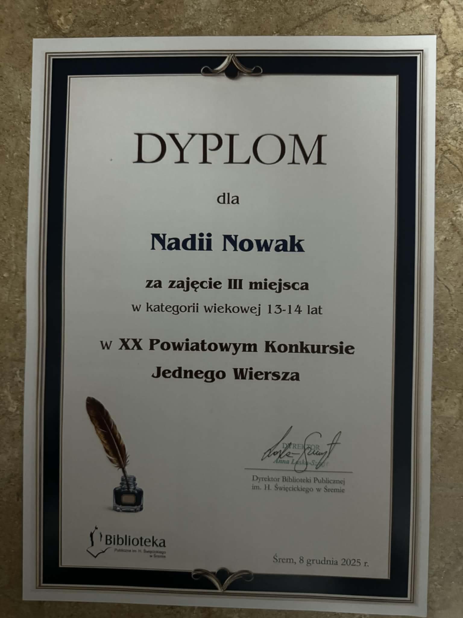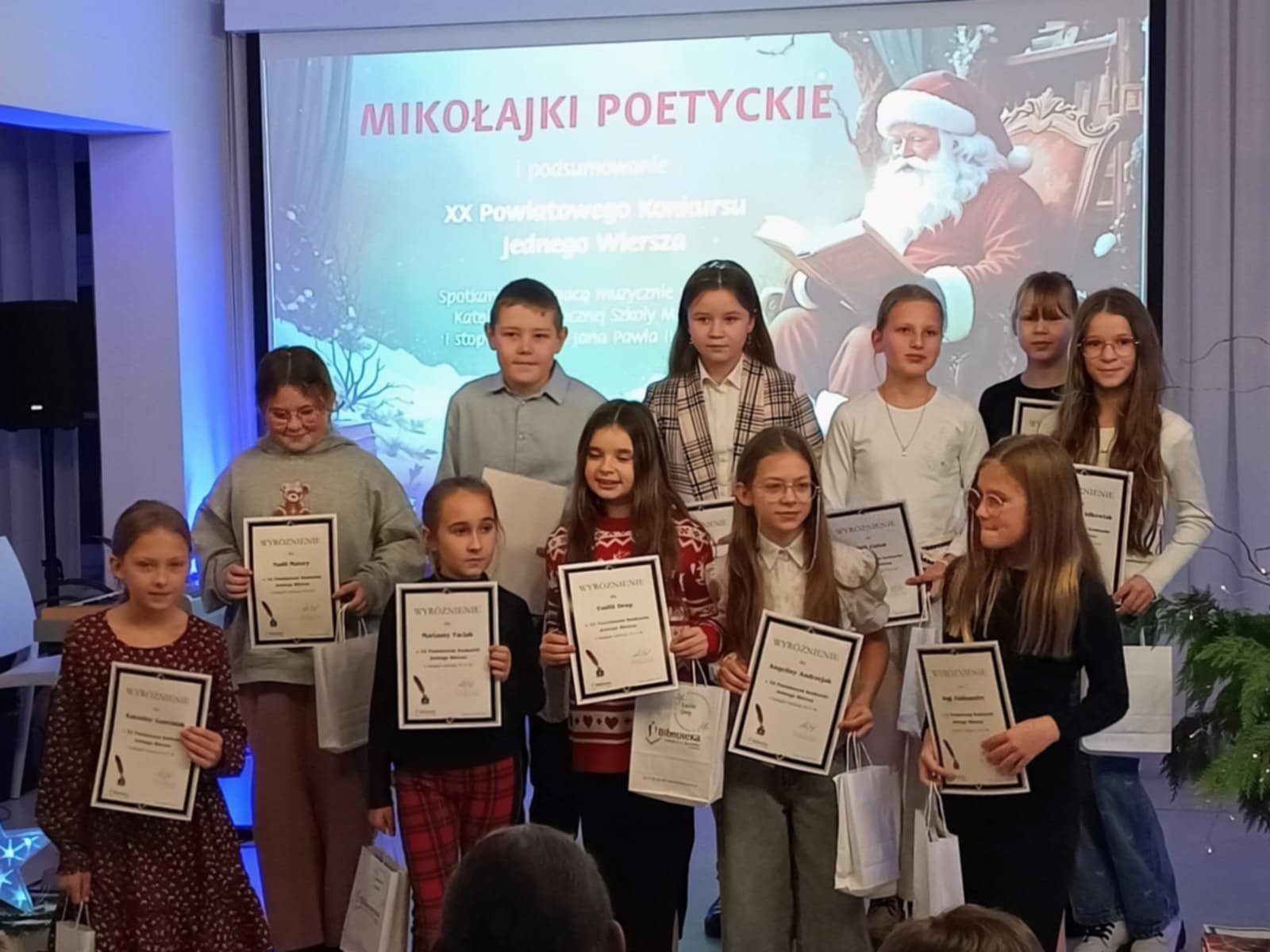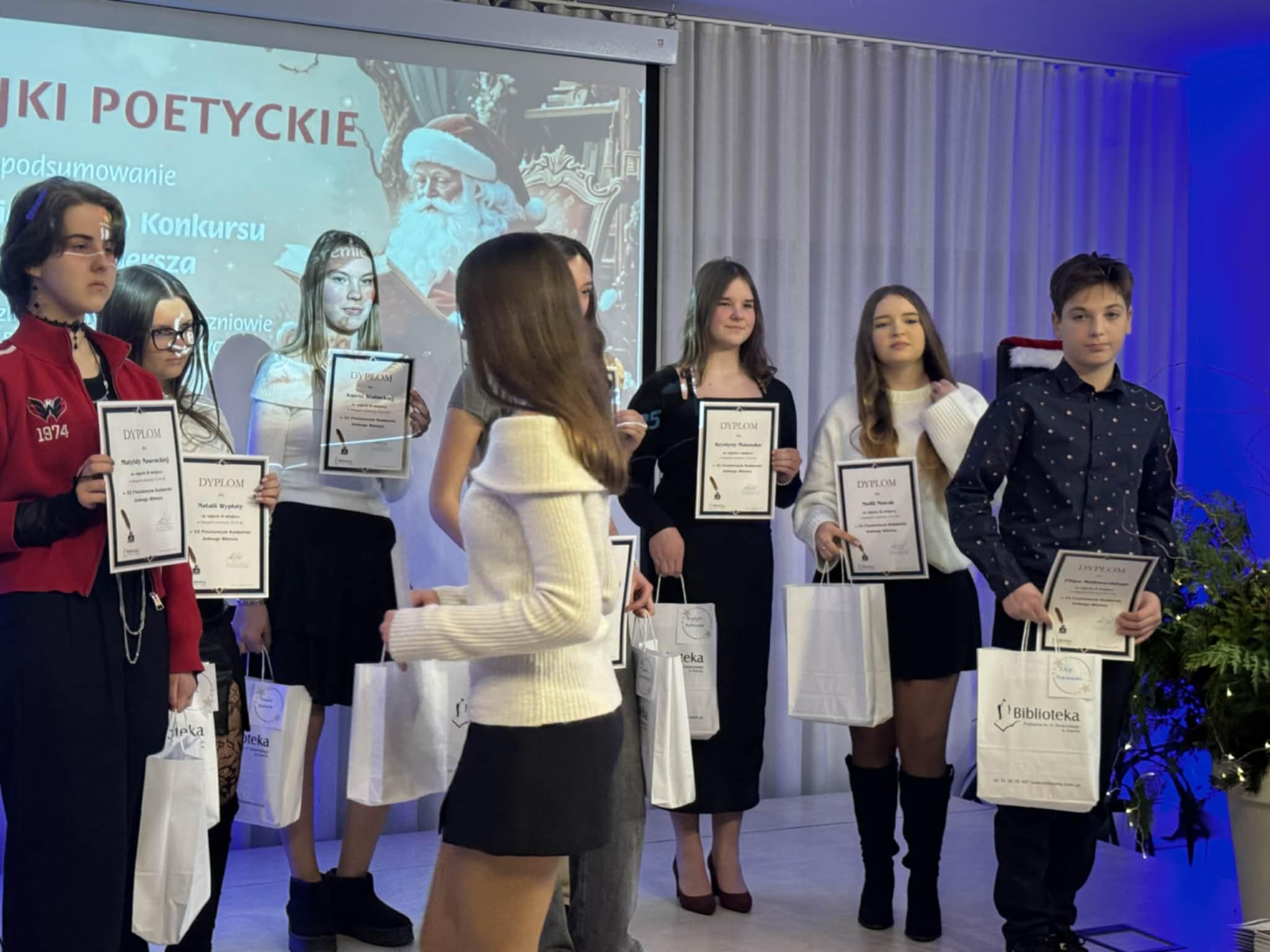 W poniedziałkowe popołudnie 8 grudnia w Bibliotece Publicznej w Śremie odbyło się wręczenie nagród w Powiatowym Konkursie Jednego Wiersza. Jest nam bardzo miło, ponieważ w gronie laureatów znalazły się aż 4 uczennice z naszej szkoły:
