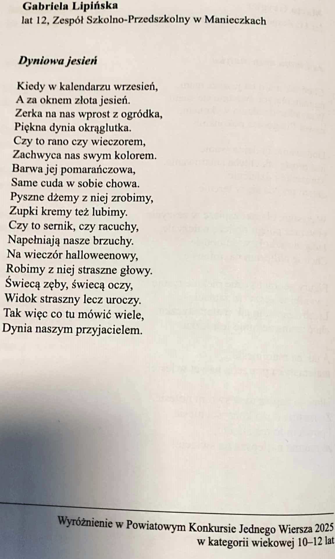 ANGELINA ANDRZEJAK i MARTA GRYGIER z kl. V oraz GABRIELA LIPIŃSKA z kl. VI otrzymały wyróżnienia.