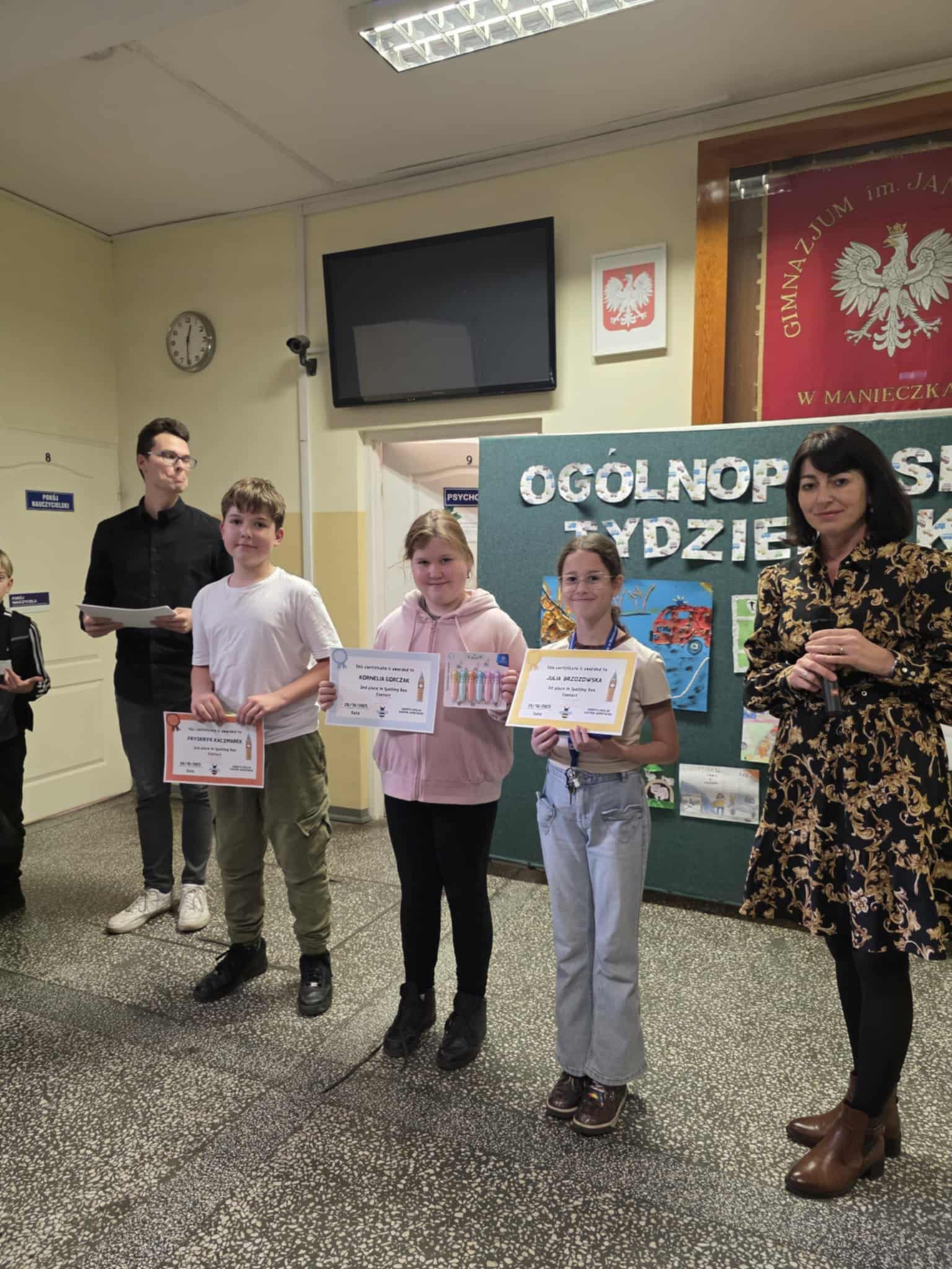 Konkurs Literowania w Języku angielskim pt. "Spelling Bee" cieszył się dużym zainteresowaniem wśród klas III i IV. Szesnaścioro uczniów sprawdziło się w poprawności literowania po angielsku losowo wybranych wyrazów. Emocji było sporo, gdyż dotarliśmy aż do 3 rundy, aby wyłonić najlepszych, a są nimi Julia Brzozowska, Kornelia Górczak oraz Fryderyk Kaczmarek. Organizatorami byli Pani Dorota Cieślak oraz Pan Kacper Jankowski, którzy już przygotowują kolejne konkursy.
