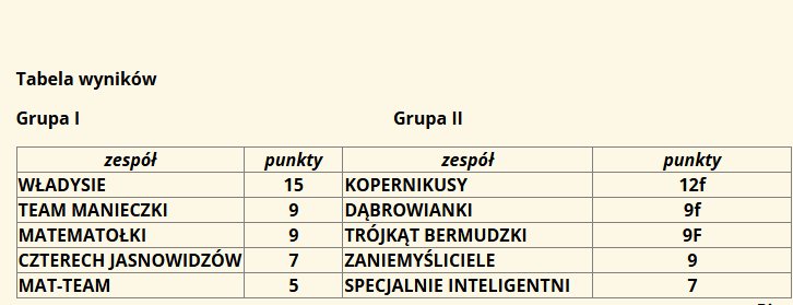 Miło nam poinformować, że ekipa pod nazwą TEAM MANIECZKI awansowała do finału Ligi Matematycznej prowadzonej przez LO w Śremie. Po trzech rundach nasi zgromadzili 9 punktów i ten wynik dał im przepustkę do finału. W skład zespołu wchodzą: Marianna Majchrowska, Krzysztof Owsianny, Nataniel Michalak i Igor Nowak, wszyscy z kl. VIII. Opiekunką teamu jest Pani Magdalena Fabisiak - Homska. Wspomniany wcześniej finał już 26 marca w LO w Śremie. Gratulujemy i trzymamy kciuki!