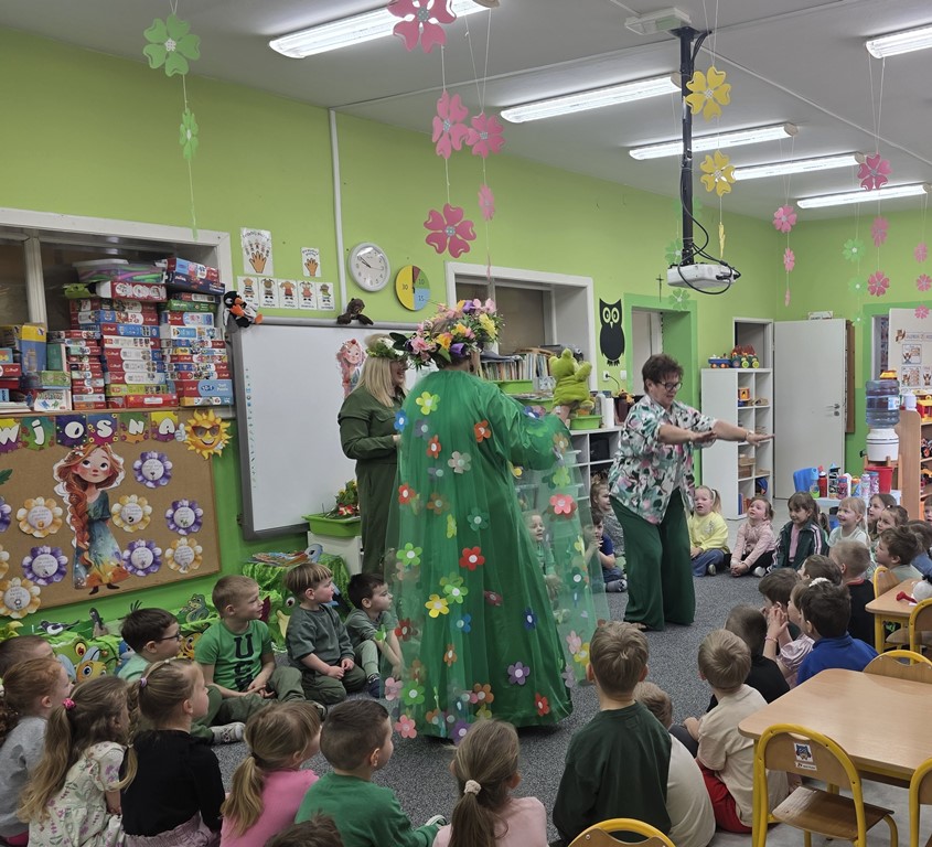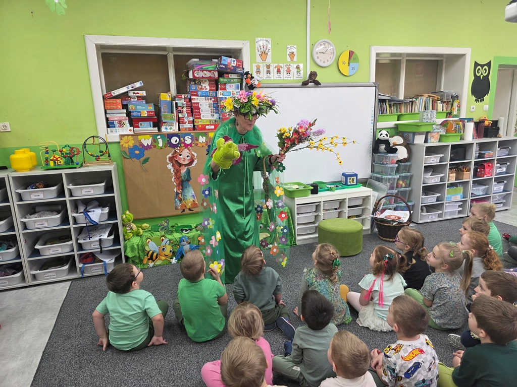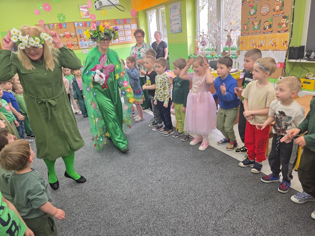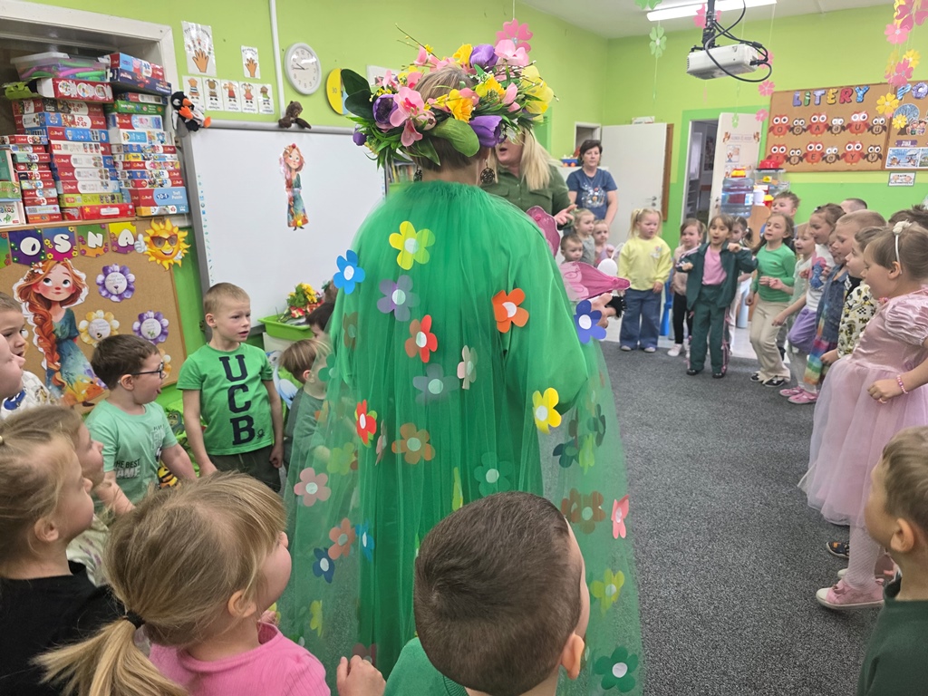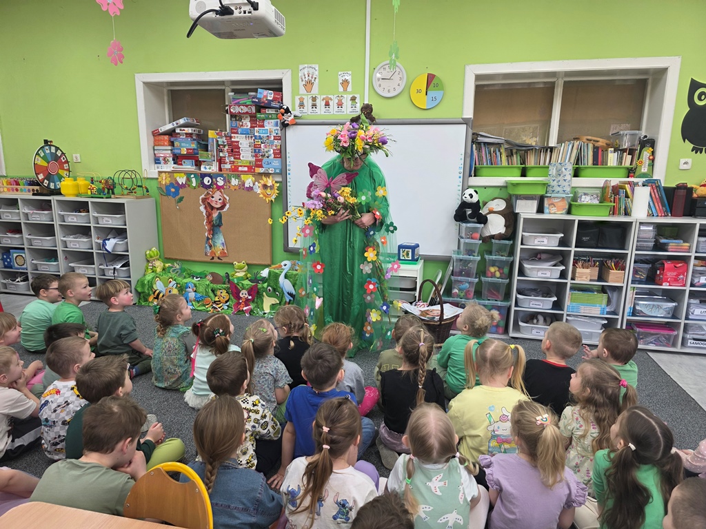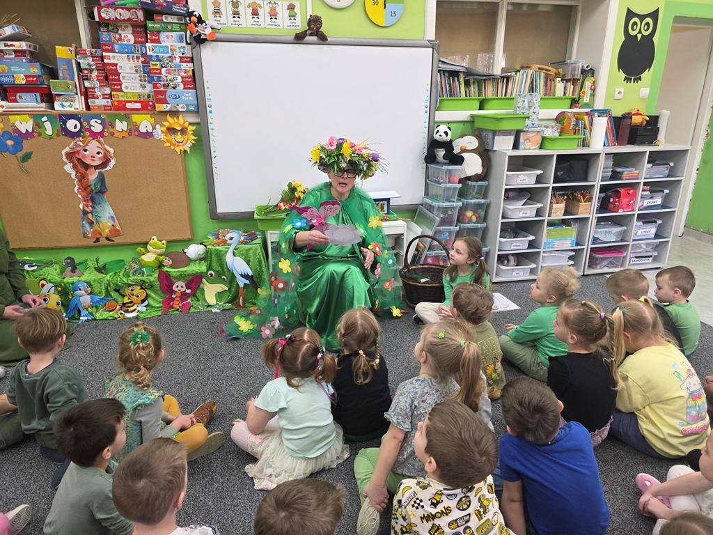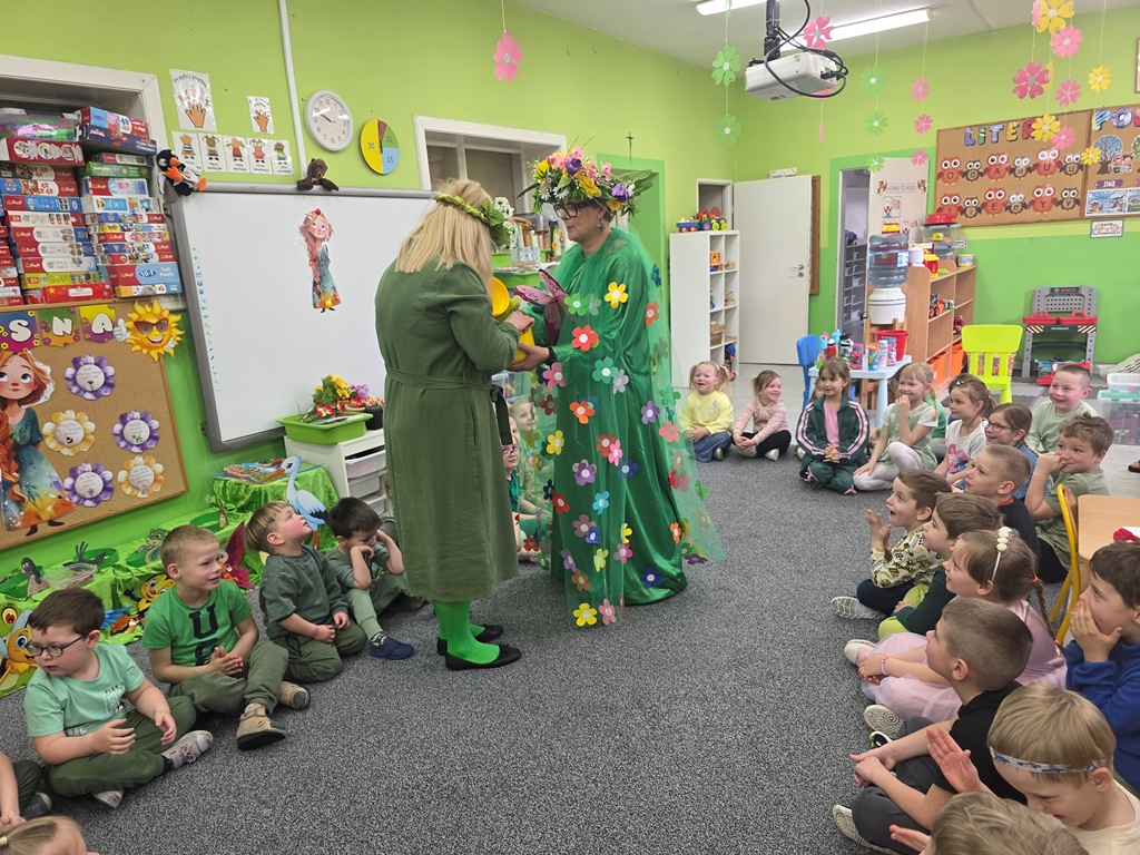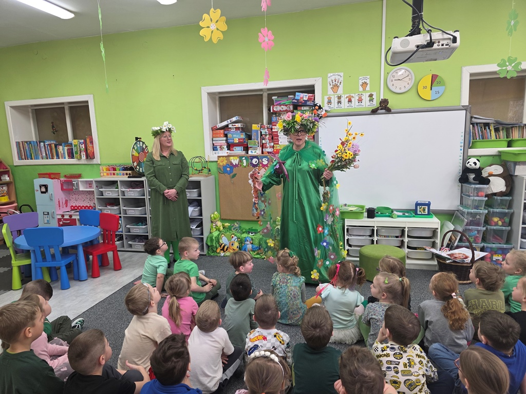 Odwiedziła nas Pani Wiosna, która zachwyciła wszystkich swoją piękną, zieloną, kwiecistą suknią oraz wiosennym uśmiechem Towarzyszyły jej Kwiatowe Wróżki, które wprowadziły dzieci w magiczny, wiosenny nastrój