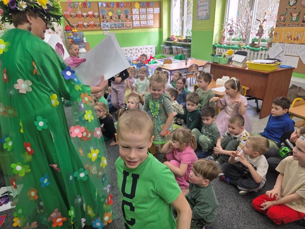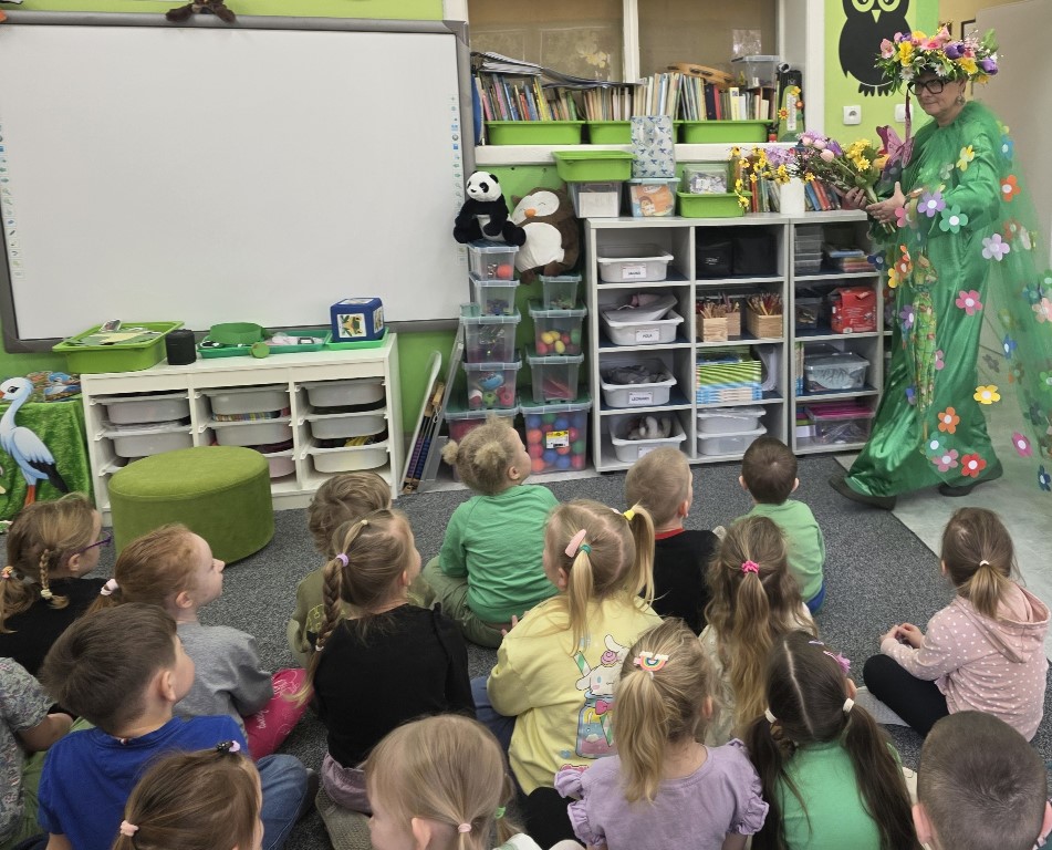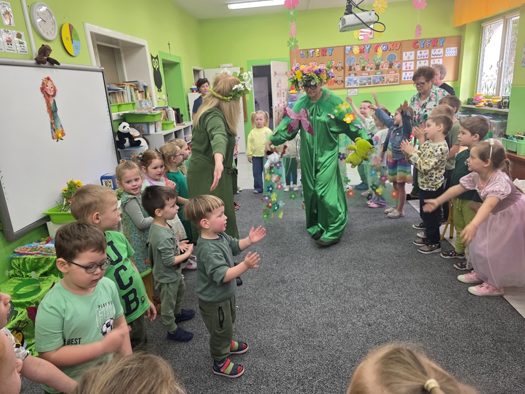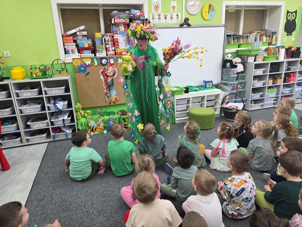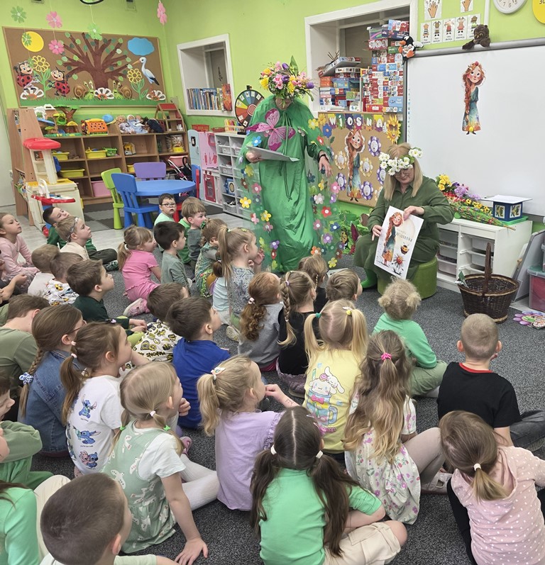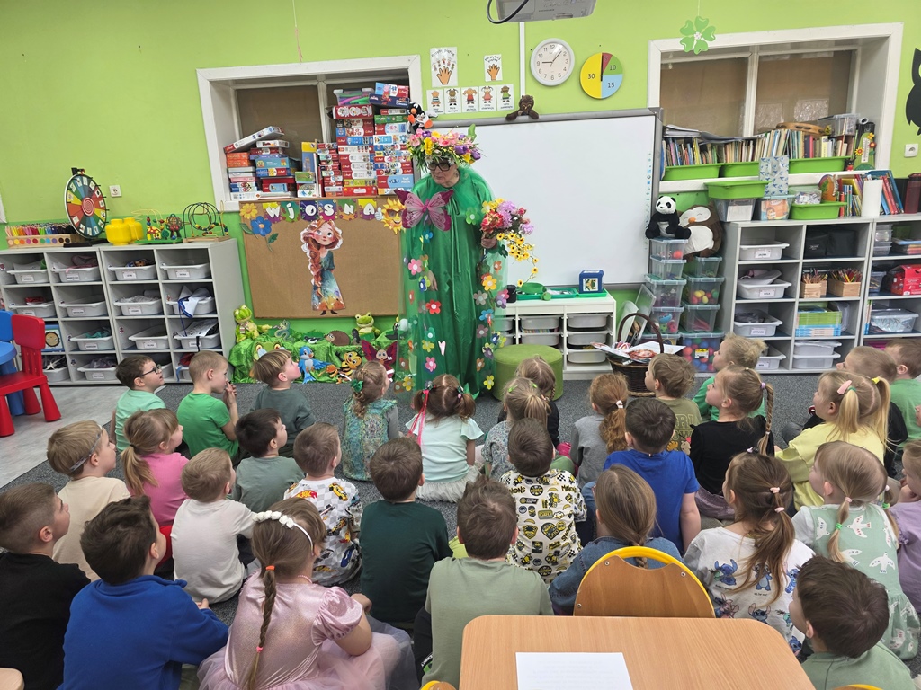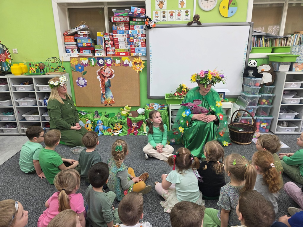 Odwiedziła nas Pani Wiosna, która zachwyciła wszystkich swoją piękną, zieloną, kwiecistą suknią oraz wiosennym uśmiechem Towarzyszyły jej Kwiatowe Wróżki, które wprowadziły dzieci w magiczny, wiosenny nastrój