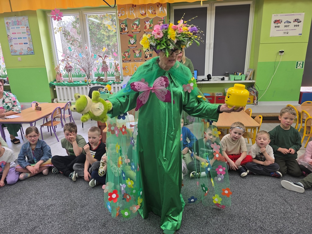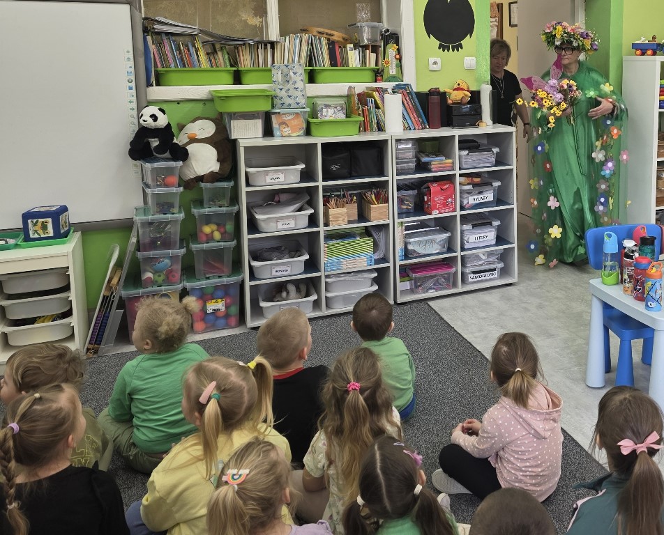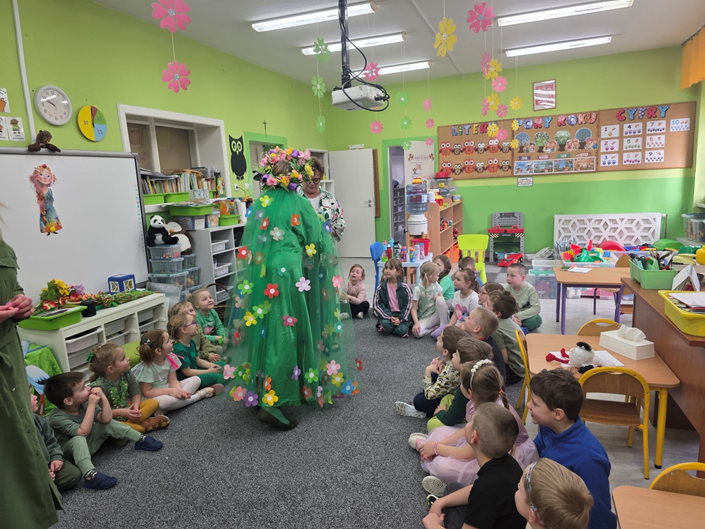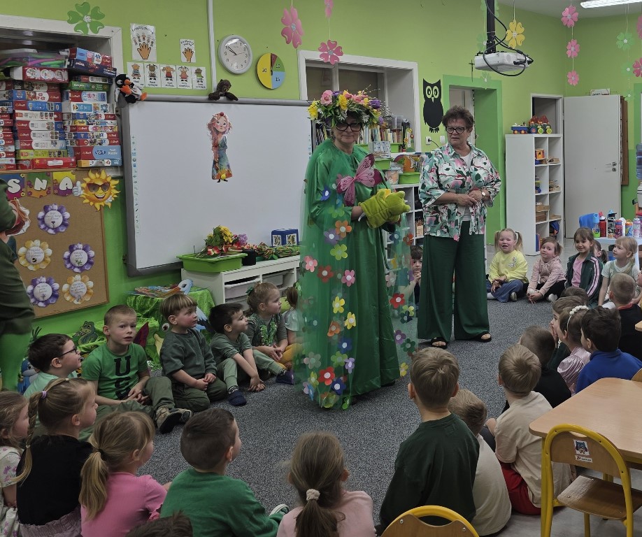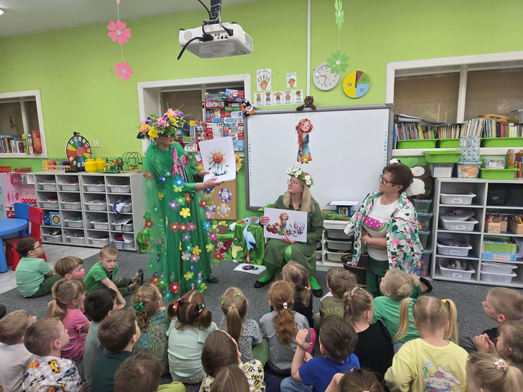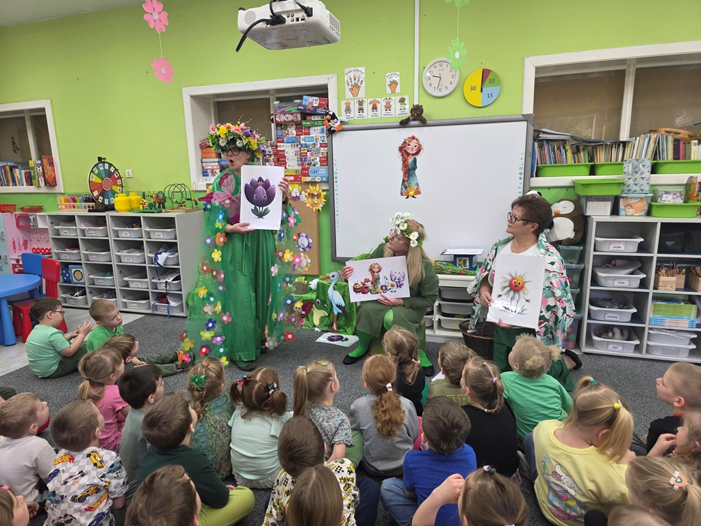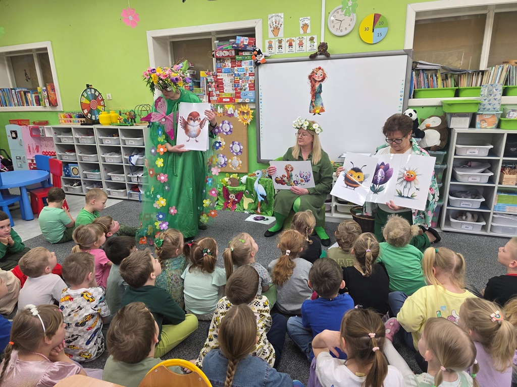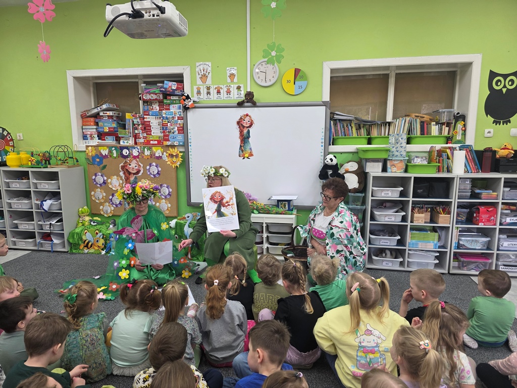 Odwiedziła nas Pani Wiosna, która zachwyciła wszystkich swoją piękną, zieloną, kwiecistą suknią oraz wiosennym uśmiechem Towarzyszyły jej Kwiatowe Wróżki, które wprowadziły dzieci w magiczny, wiosenny nastrój