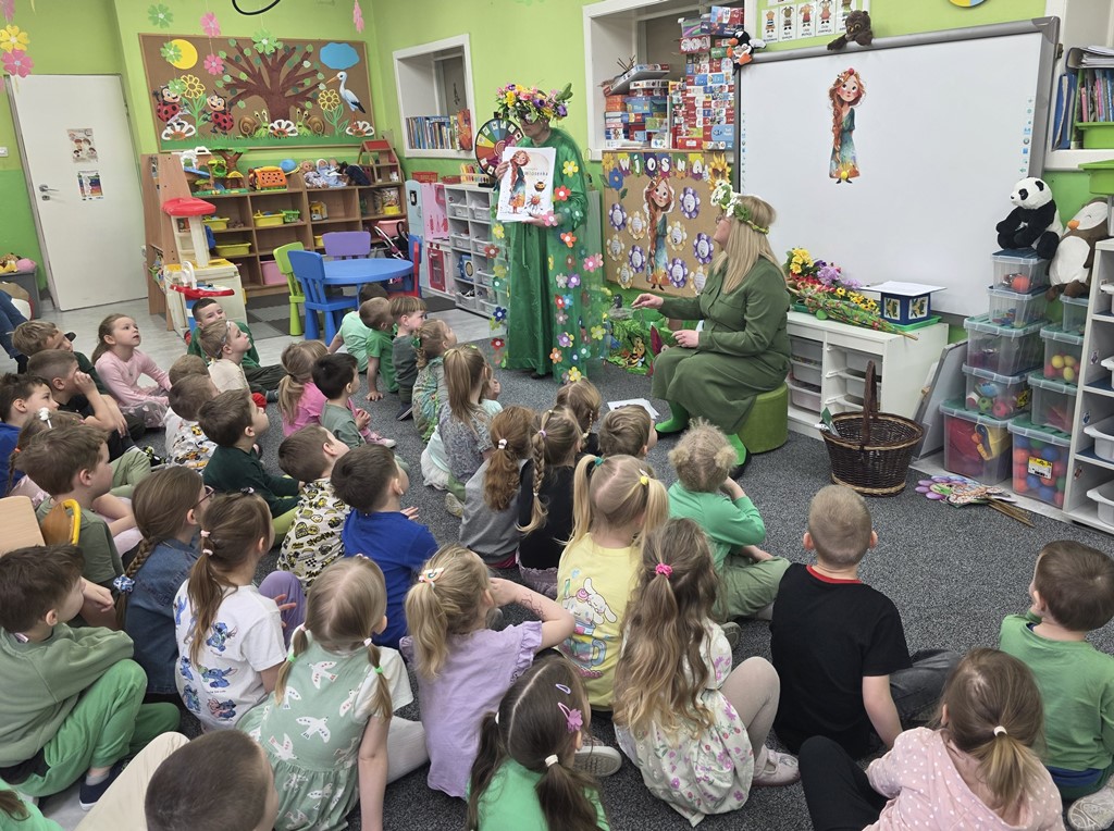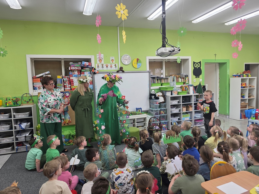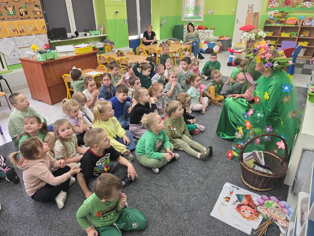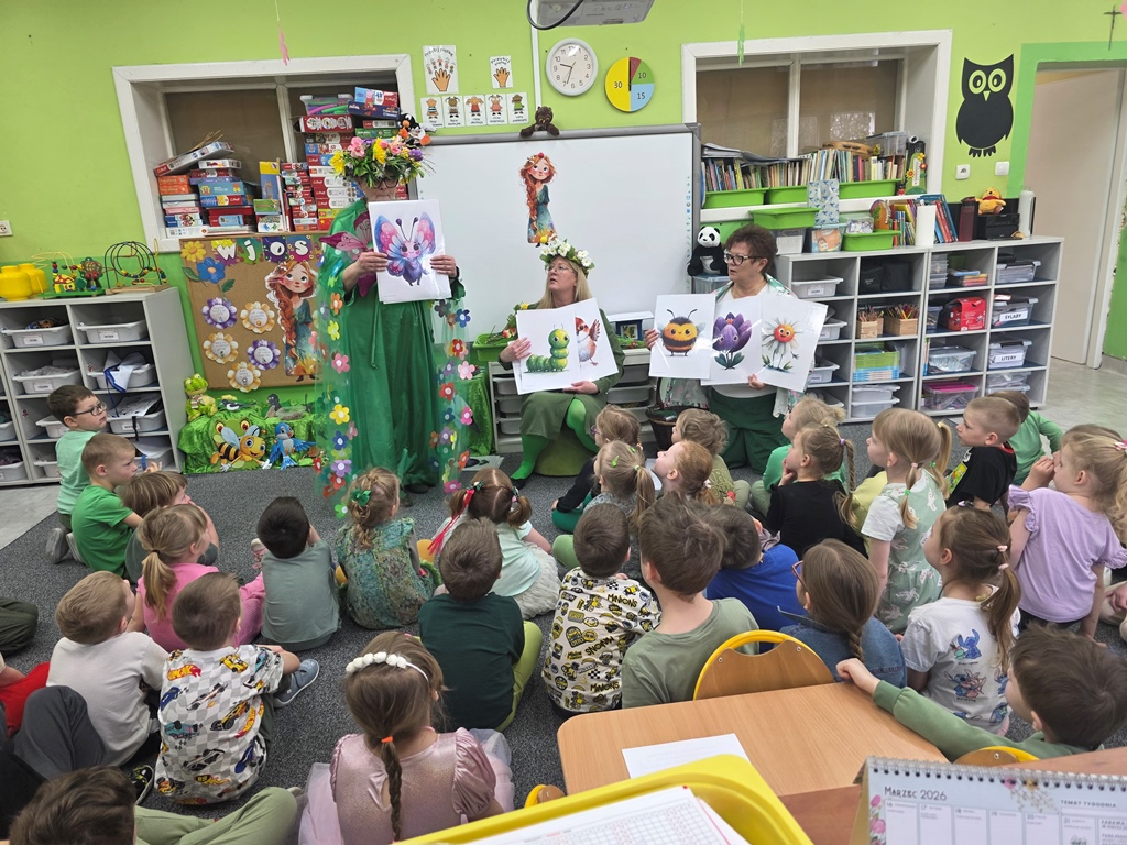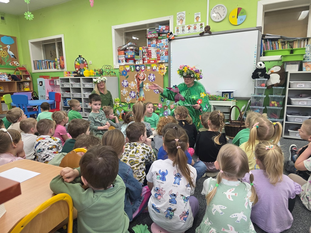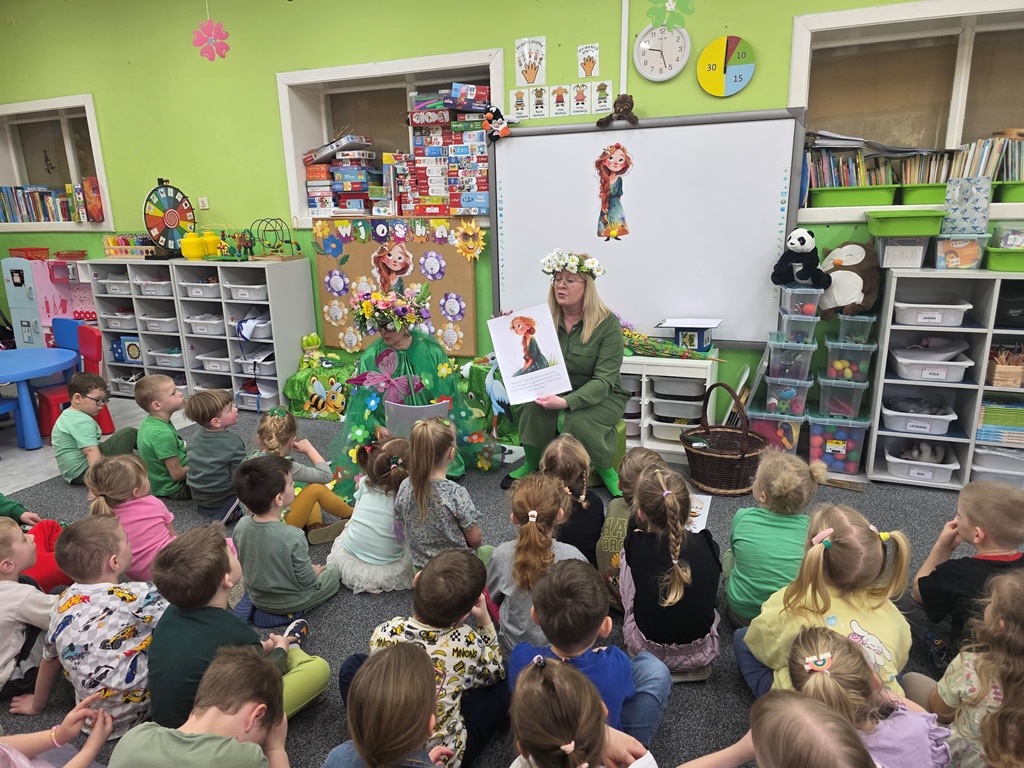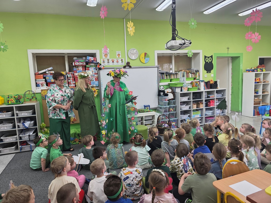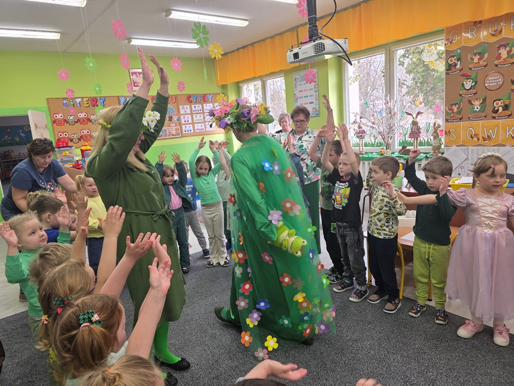 Odwiedziła nas Pani Wiosna, która zachwyciła wszystkich swoją piękną, zieloną, kwiecistą suknią oraz wiosennym uśmiechem Towarzyszyły jej Kwiatowe Wróżki, które wprowadziły dzieci w magiczny, wiosenny nastrój