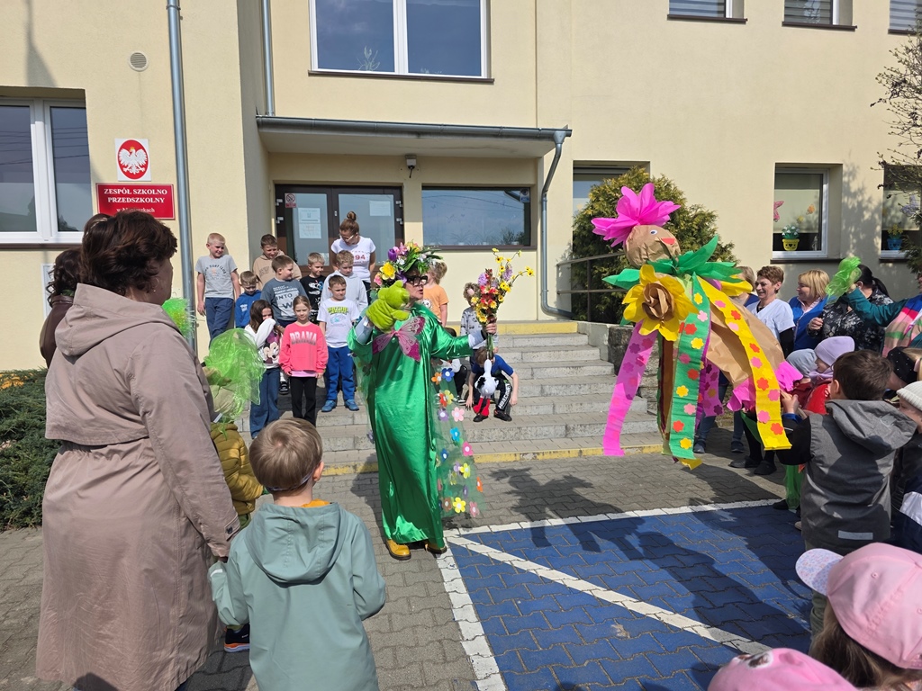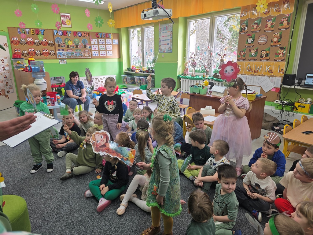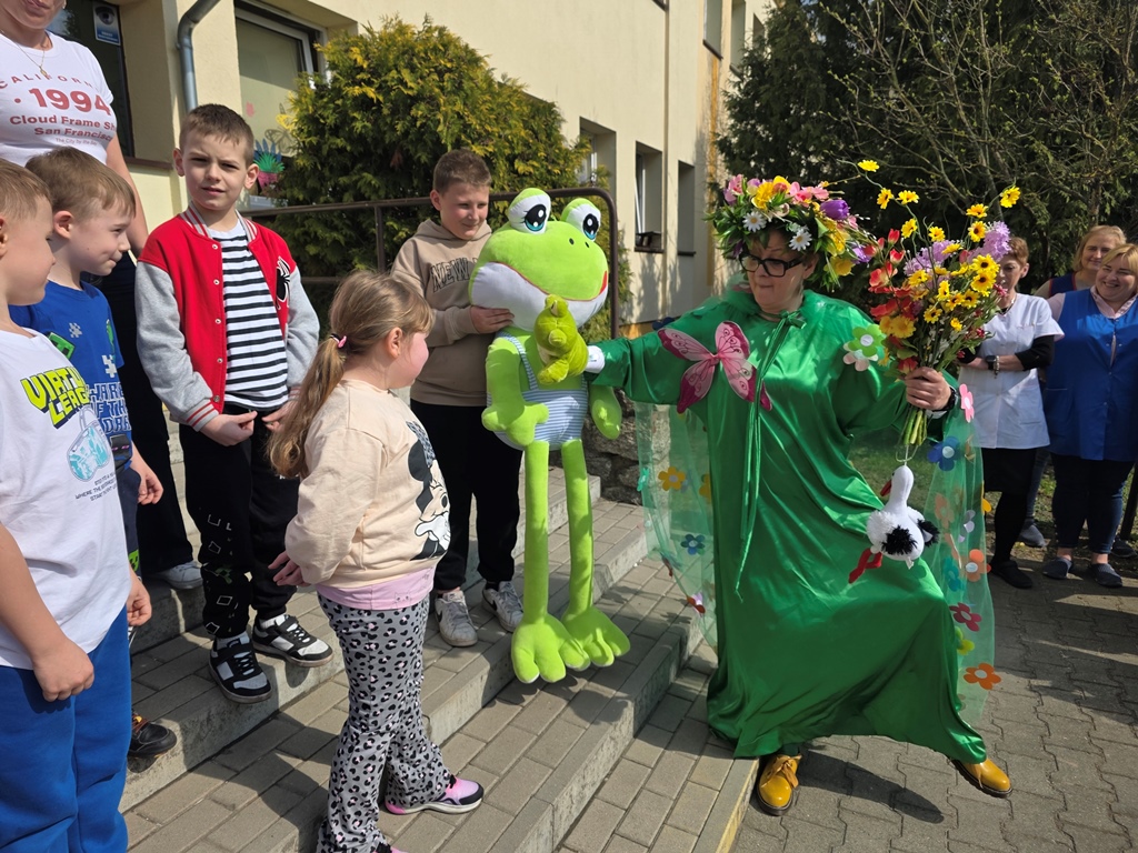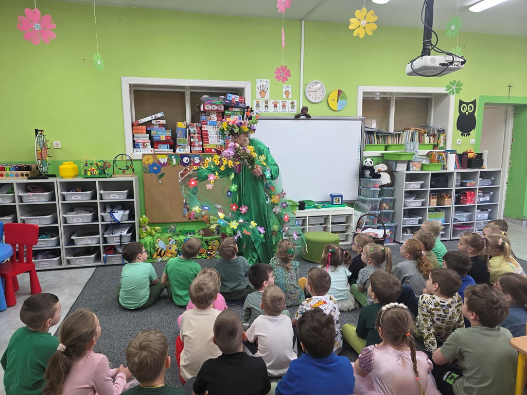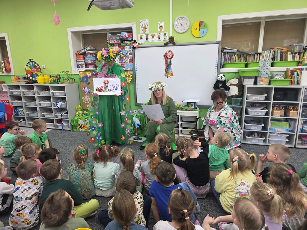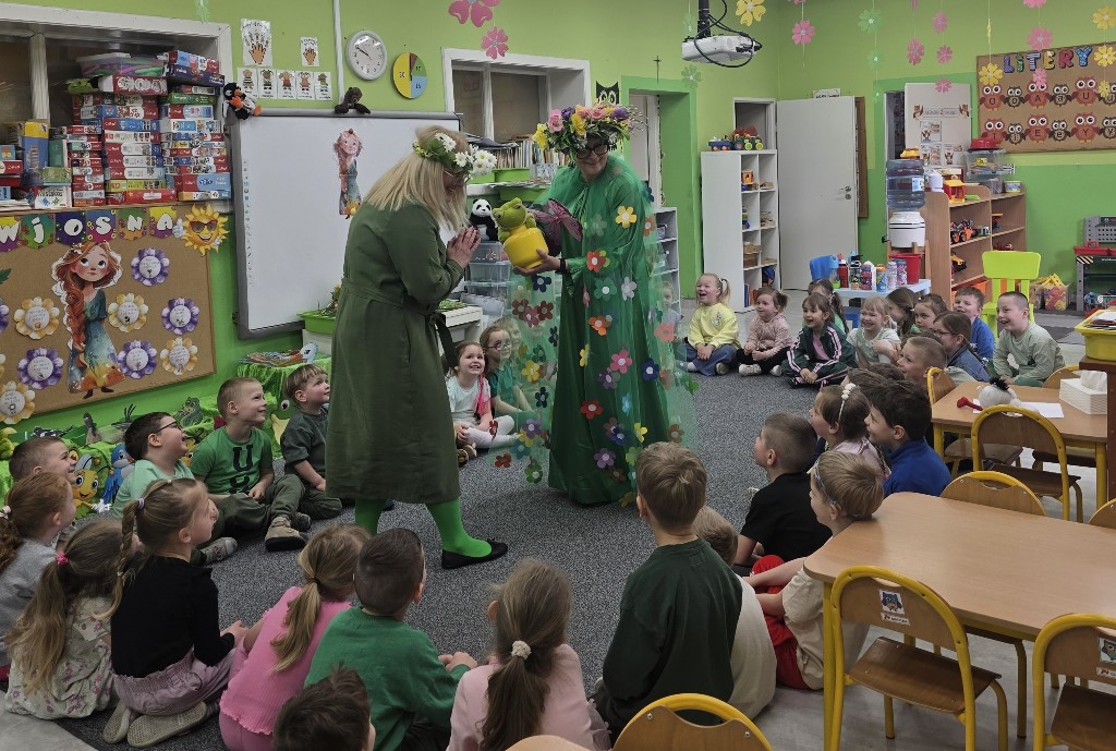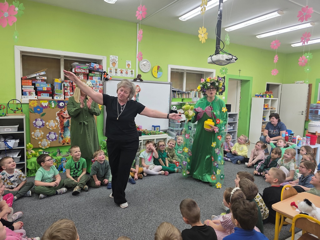 Odwiedziła nas Pani Wiosna, która zachwyciła wszystkich swoją piękną, zieloną, kwiecistą suknią oraz wiosennym uśmiechem Towarzyszyły jej Kwiatowe Wróżki, które wprowadziły dzieci w magiczny, wiosenny nastrój