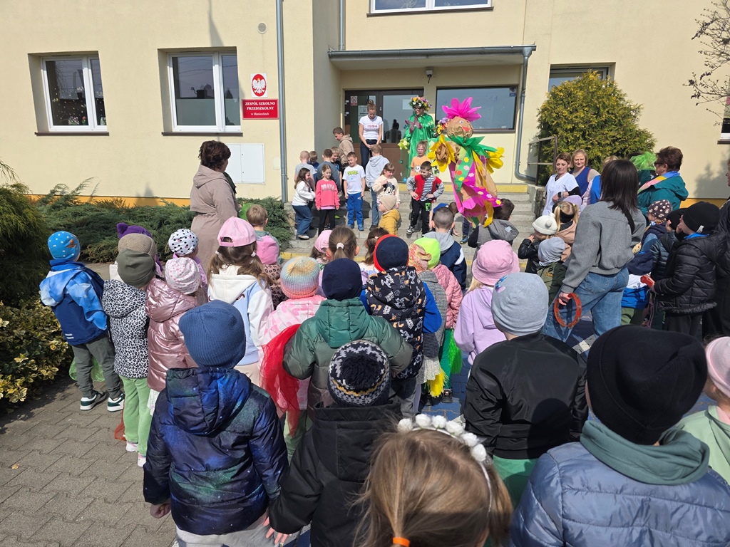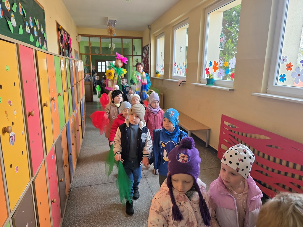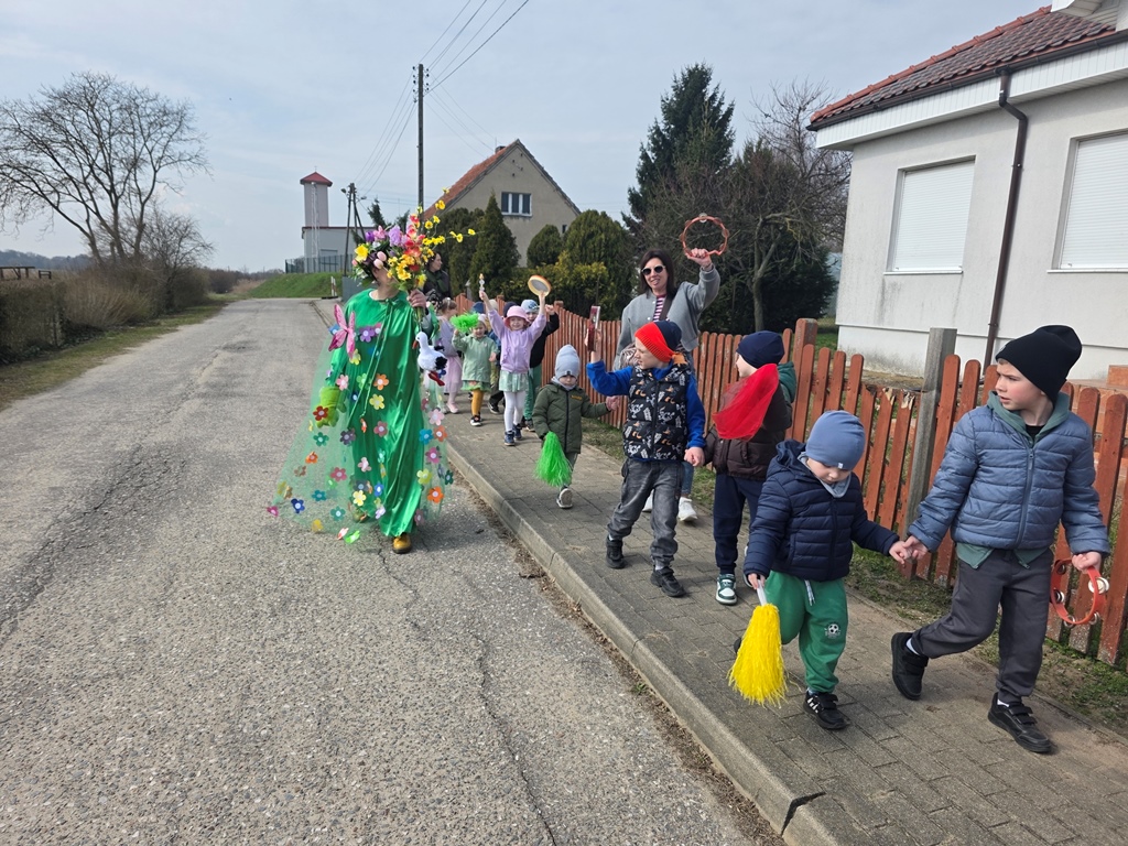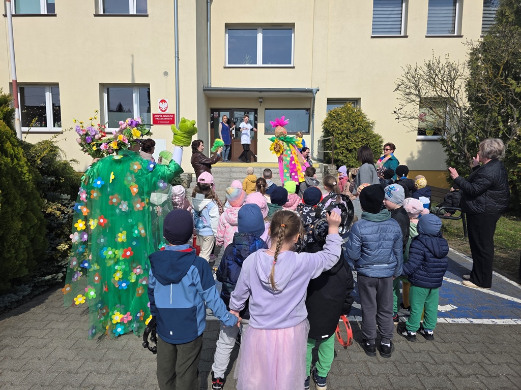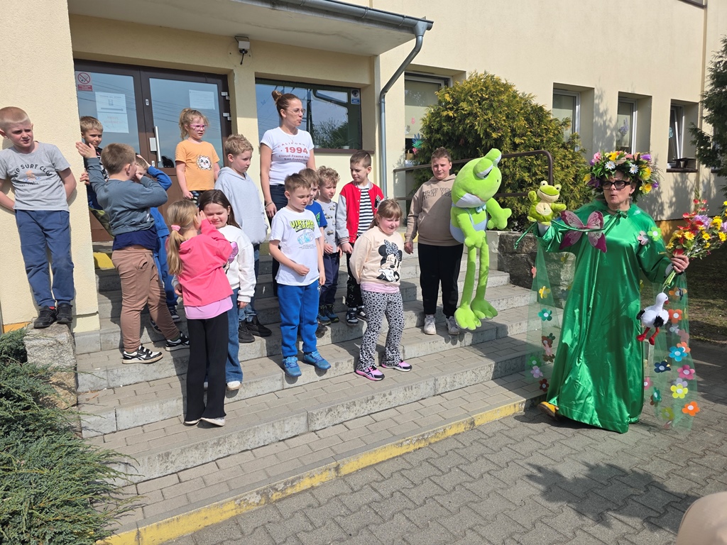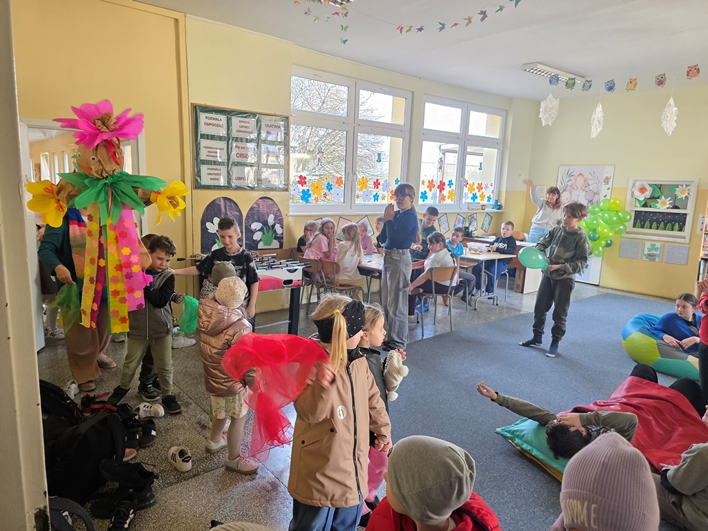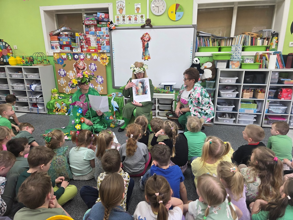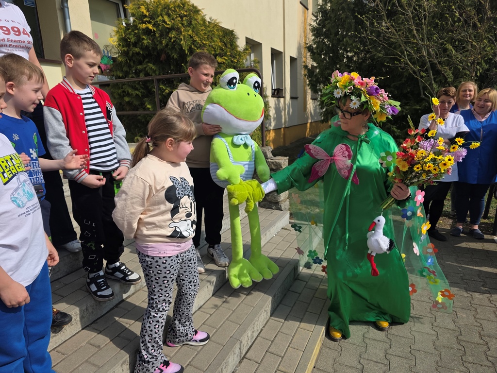 Odwiedziła nas Pani Wiosna, która zachwyciła wszystkich swoją piękną, zieloną, kwiecistą suknią oraz wiosennym uśmiechem Towarzyszyły jej Kwiatowe Wróżki, które wprowadziły dzieci w magiczny, wiosenny nastrój
