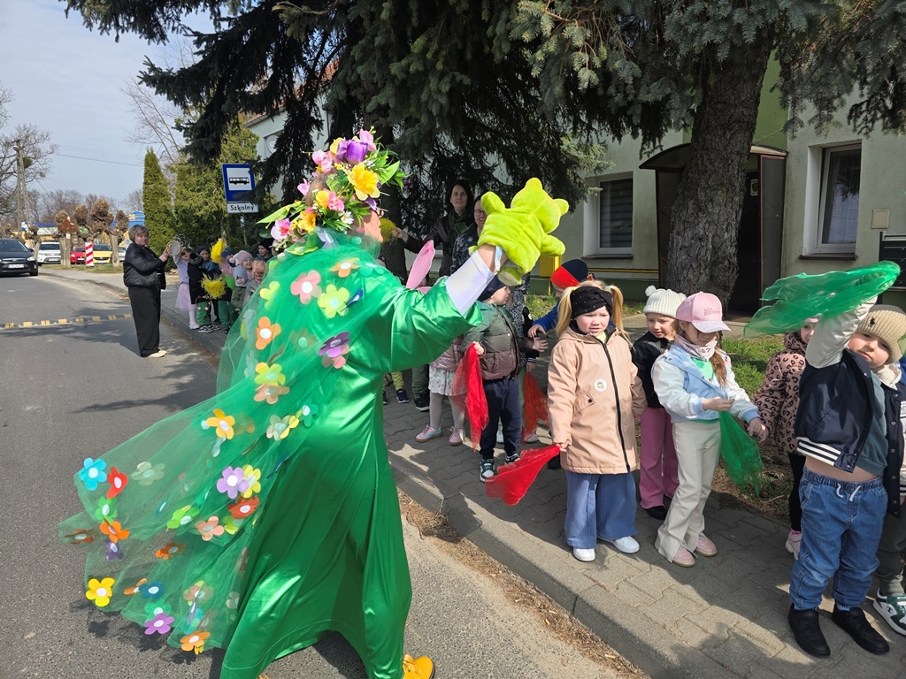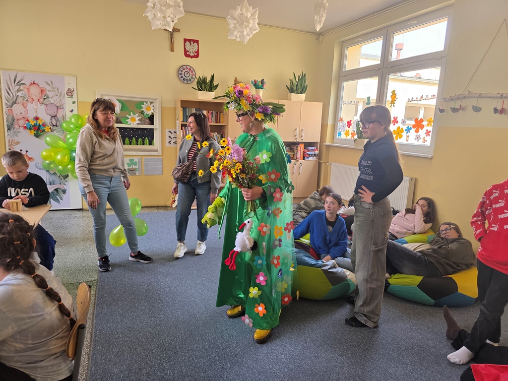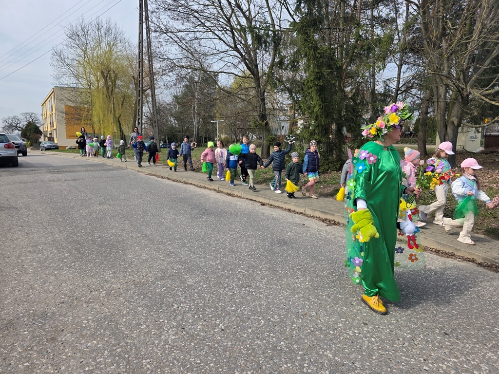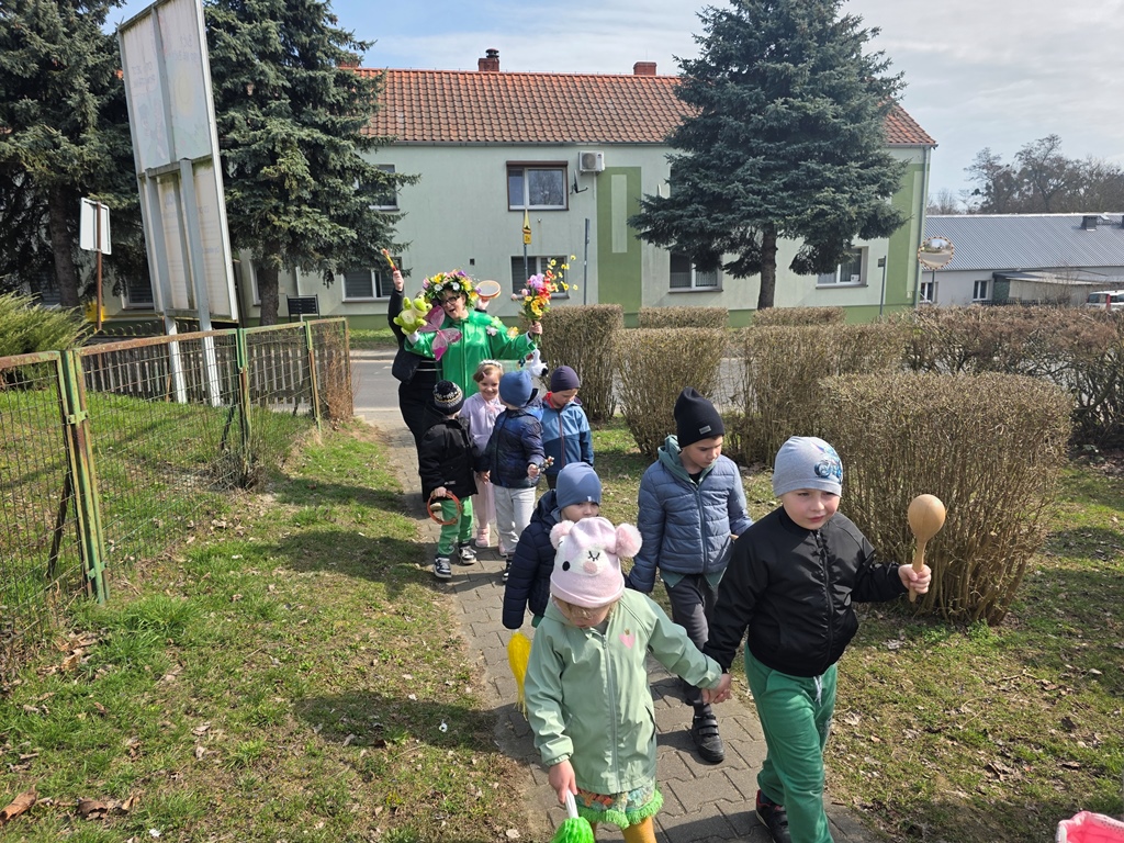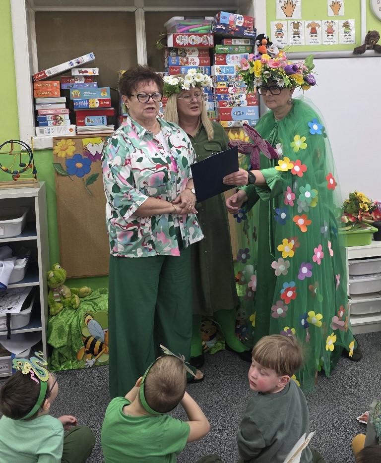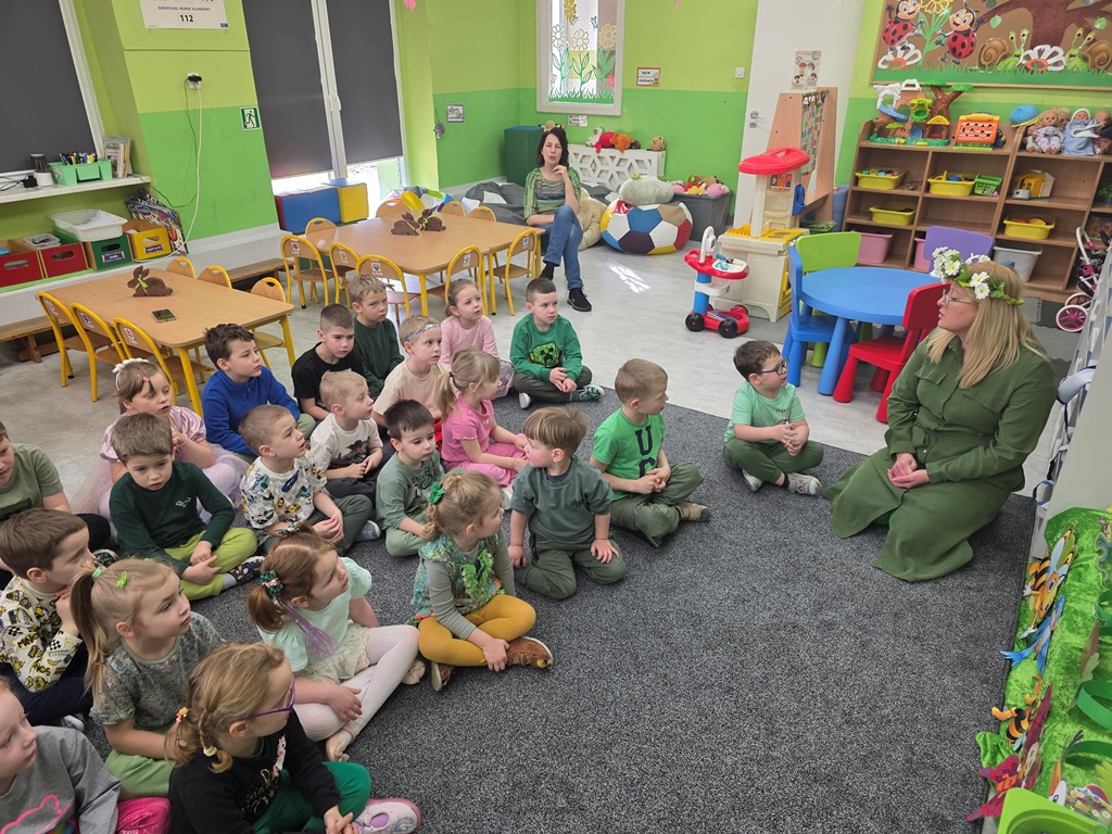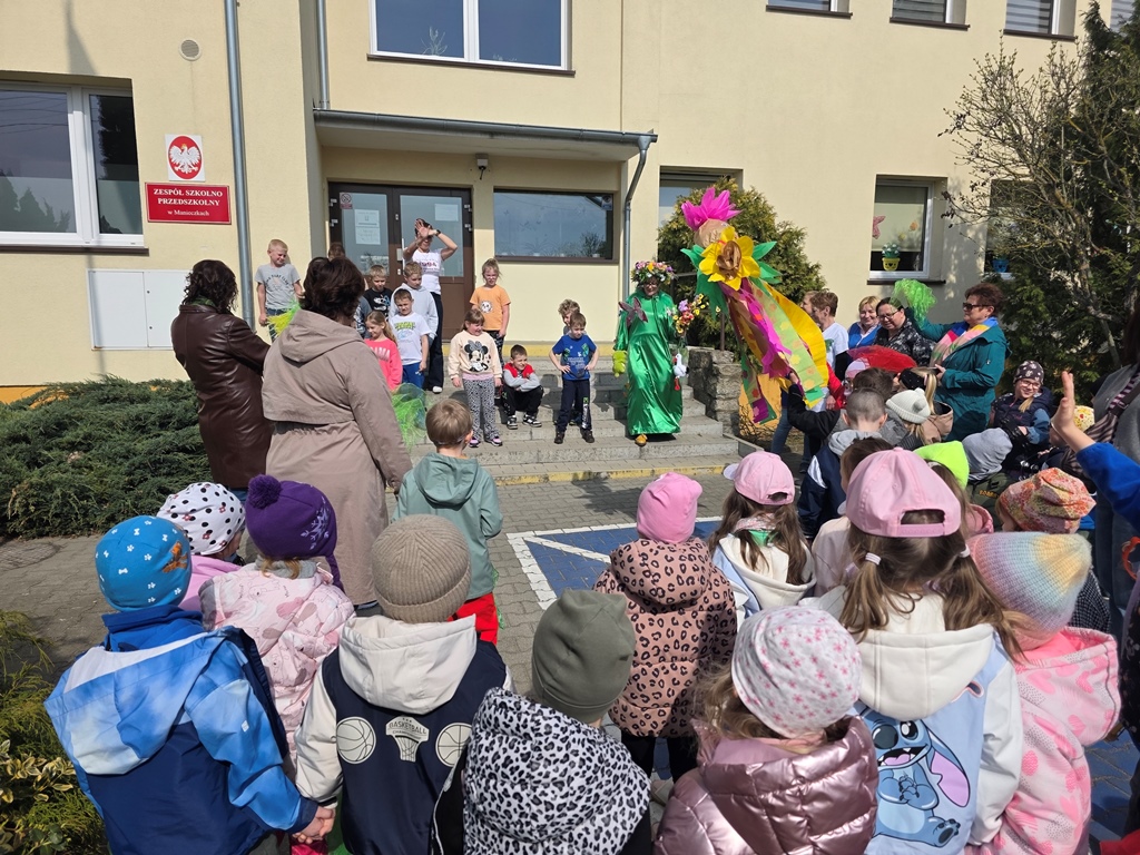Odwiedziła nas Pani Wiosna, która zachwyciła wszystkich swoją piękną, zieloną, kwiecistą suknią oraz wiosennym uśmiechem Towarzyszyły jej Kwiatowe Wróżki, które wprowadziły dzieci w magiczny, wiosenny nastrój