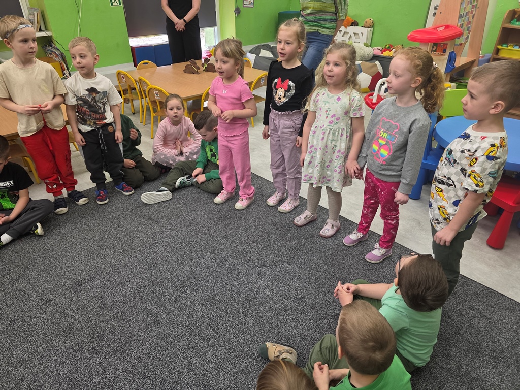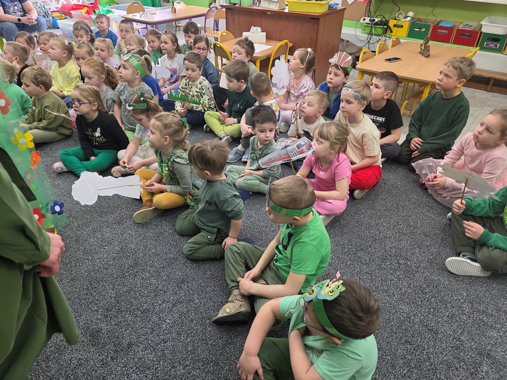 Przedszkolaki z ogromnym zaangażowaniem wysłuchały opowiadania „Wiosenka”, a następnie zaprezentowały inscenizację wiersza Jana Brzechwy „Przyjście wiosny” Dzieci świetnie poradziły sobie z zadaniem, wykazując się kreatywnością i odwagą