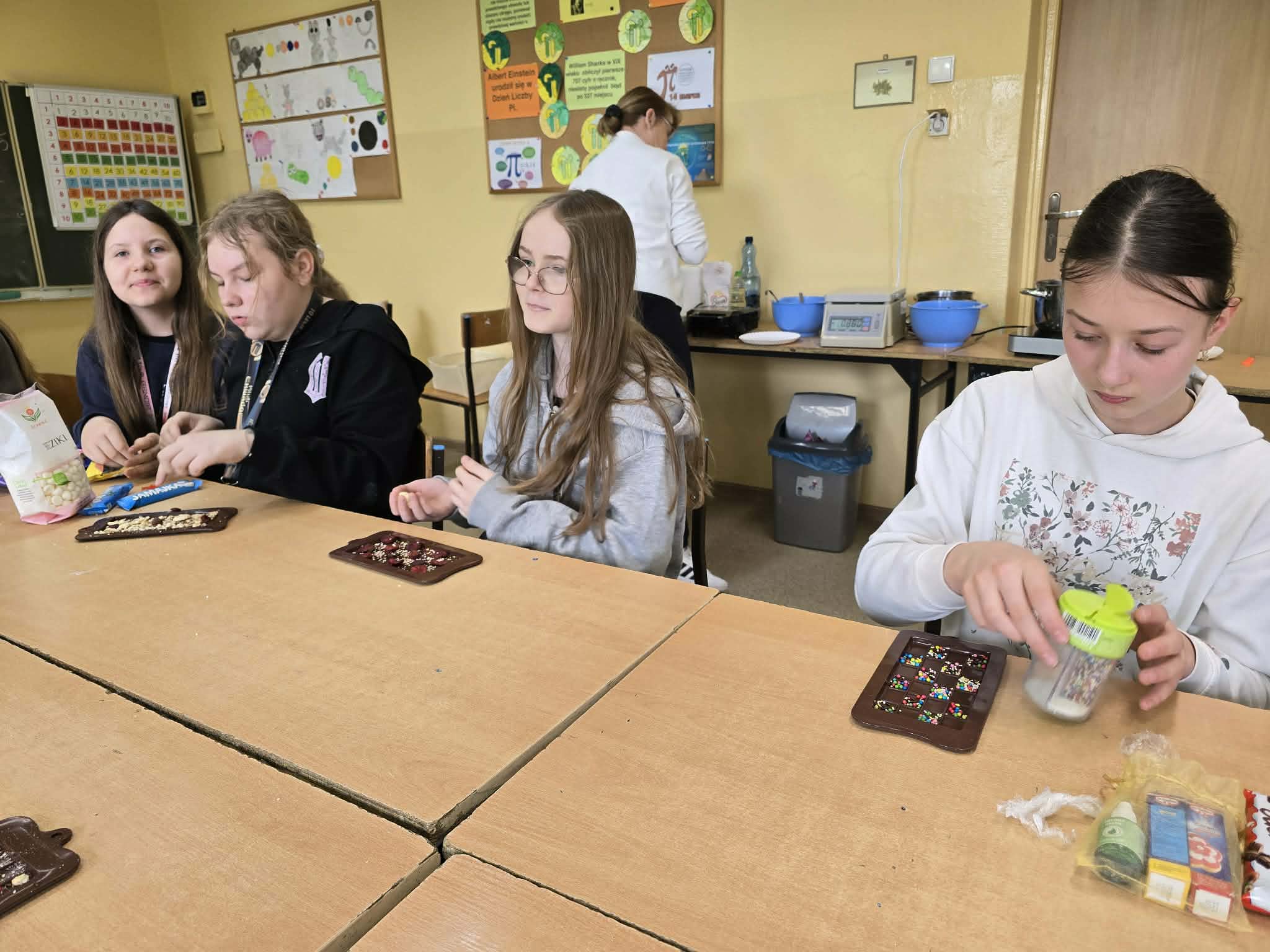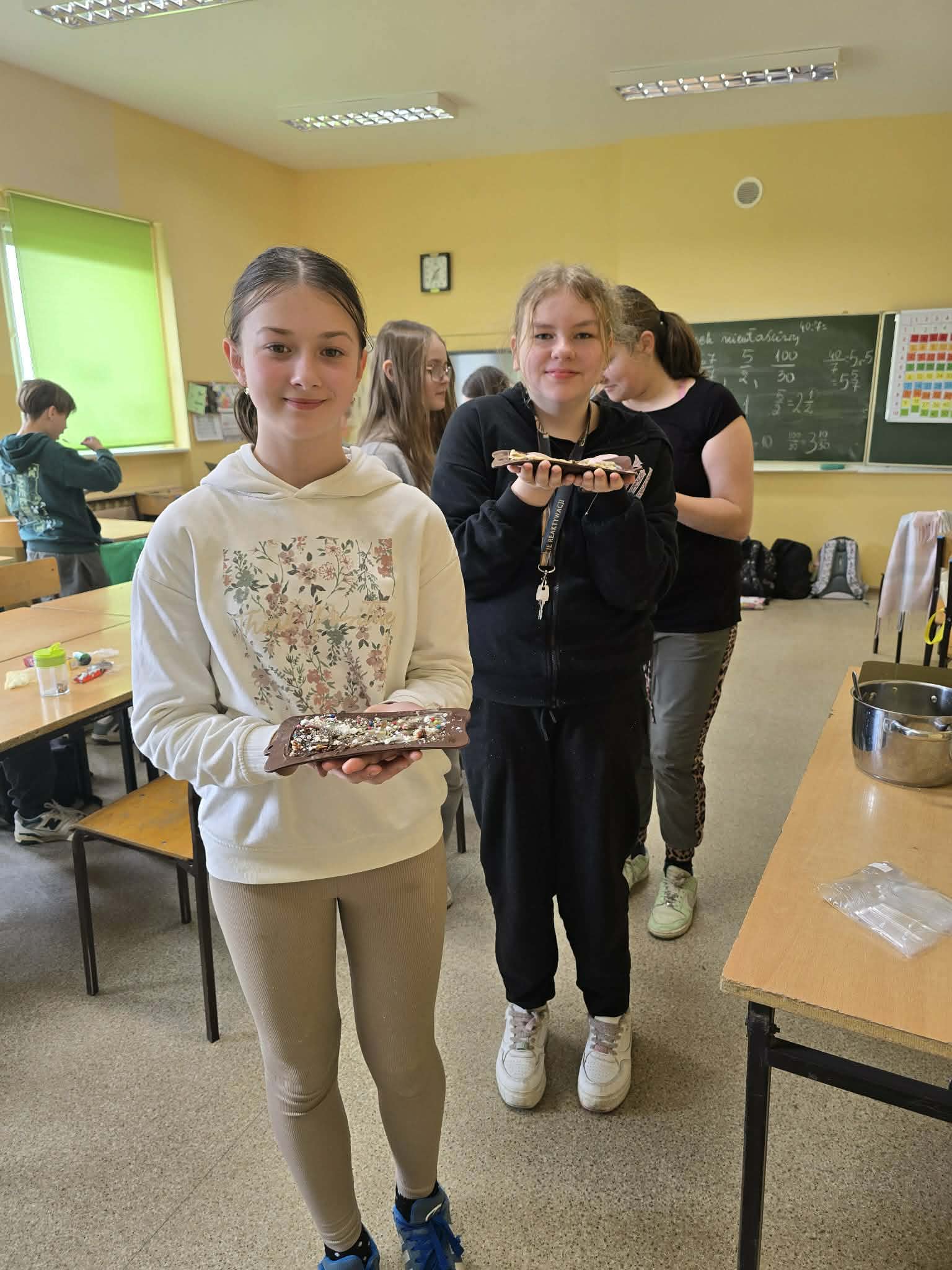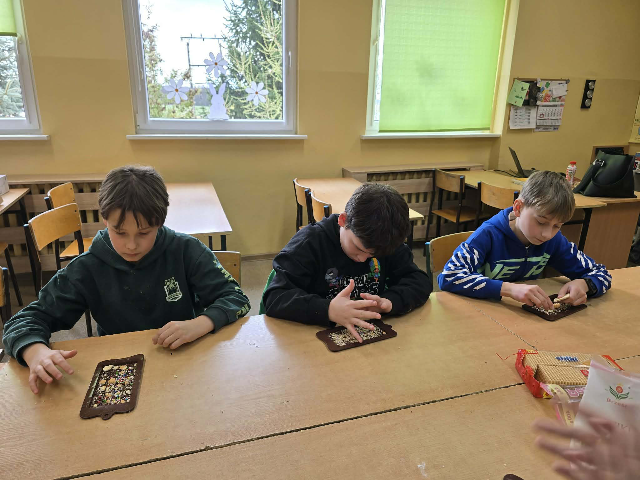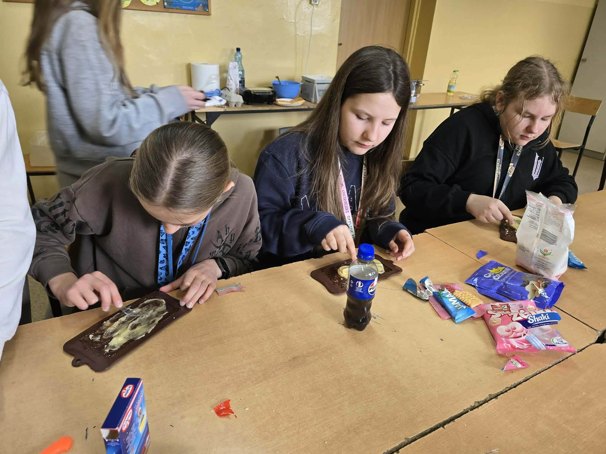 Efektem ich pracy były pięknie udekorowane tabliczki czekolady oraz pyszne, chrupiące gofry. Uczniowie z dużym zaangażowaniem podchodzili do każdego etapu przygotowań, wykazując się kreatywnością i współpracą.