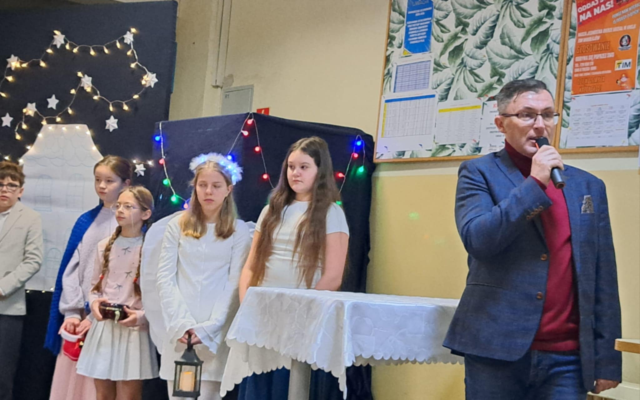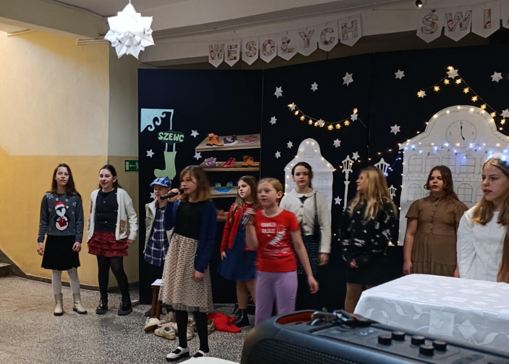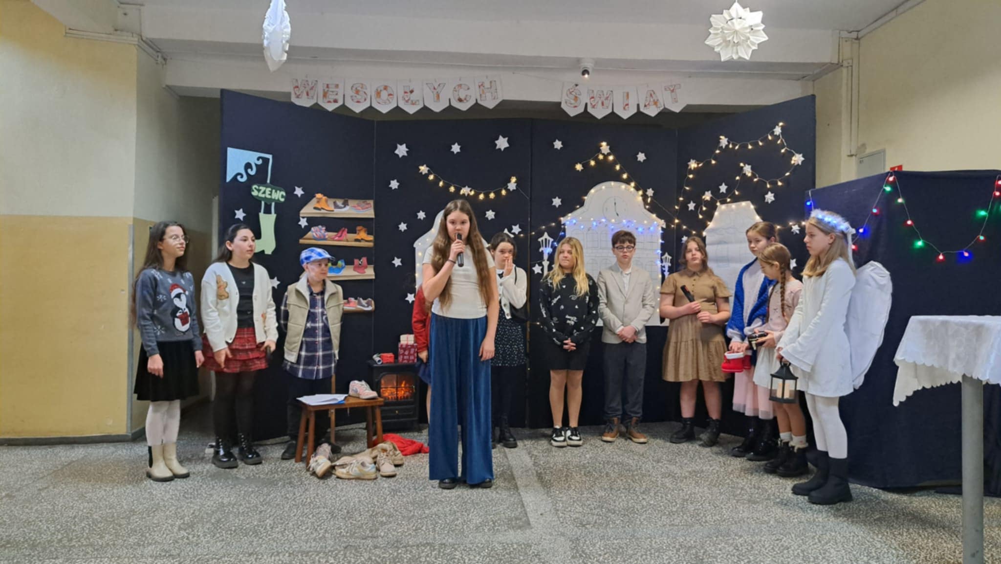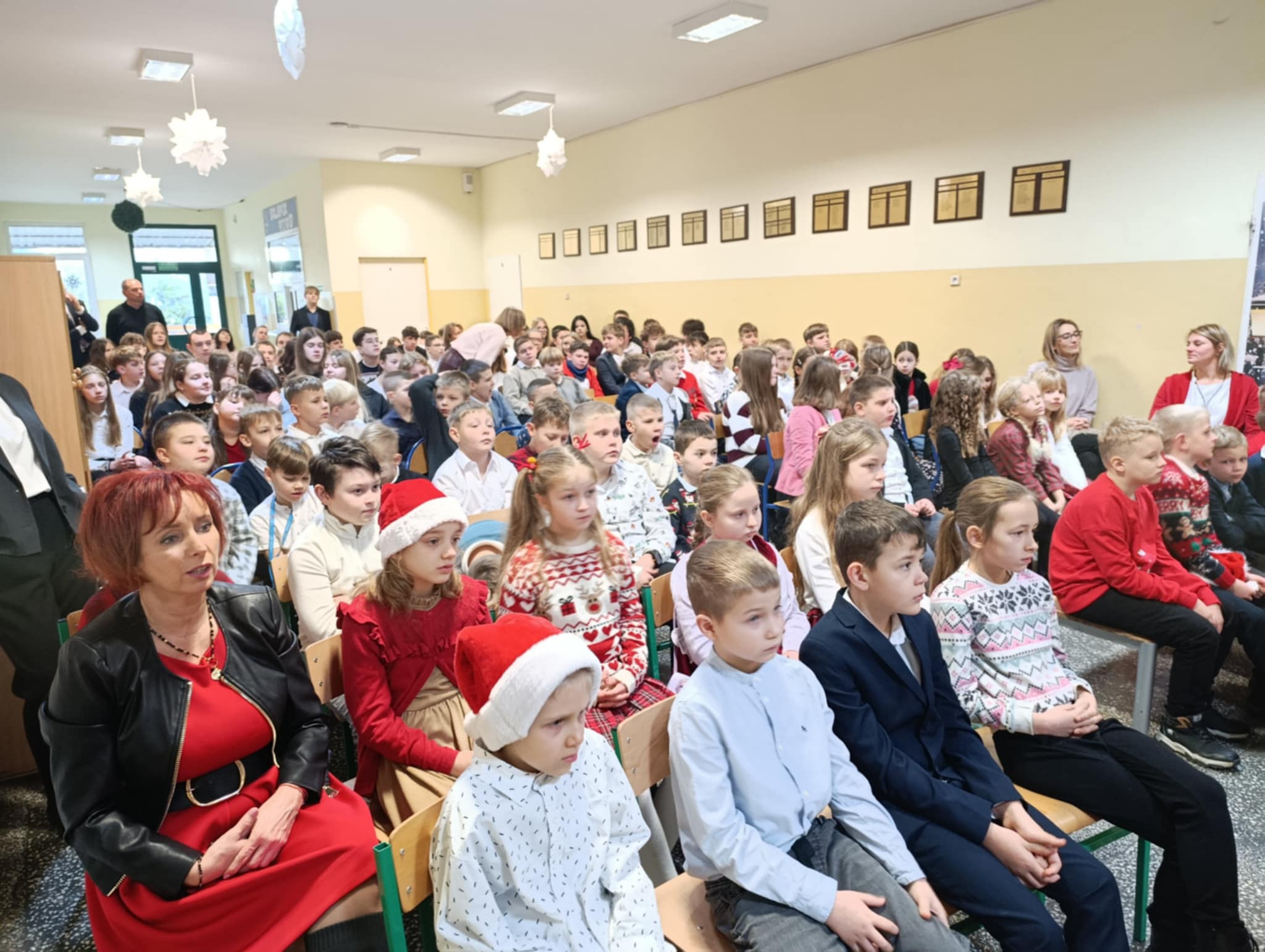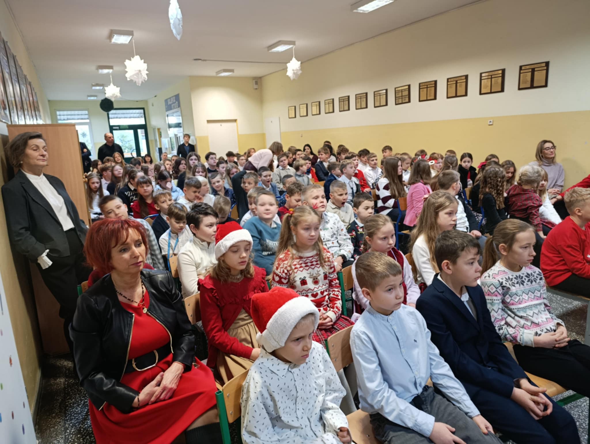 W piątek 19 grudnia wszyscy odświętnie ubrani zebraliśmy się na dolnym korytarzy, by obejrzeć spektakl teatralny wprowadzający w atmosferę Świąt Bożego Narodzenia. Aktorami byli uczniowie kl. V, a reżyserem wychowawczyni Pani Hanna Bartecka we współpracy z Panią Kasią Karczyńską. Przedstawienie było bardzo ciekawe i efektowne, wszystkim przypadło do gustu. Później wręczyliśmy nagrody i dyplomy z różnych konkursów. Były też oczywiście wspólne kolędy i życzenia świąteczne. Po zakończeniu tej części rozeszliśmy się do sal lekcyjnych, by wspólnie z wychowawcami świętować Boże Narodzenie. Wesołych Świąt!