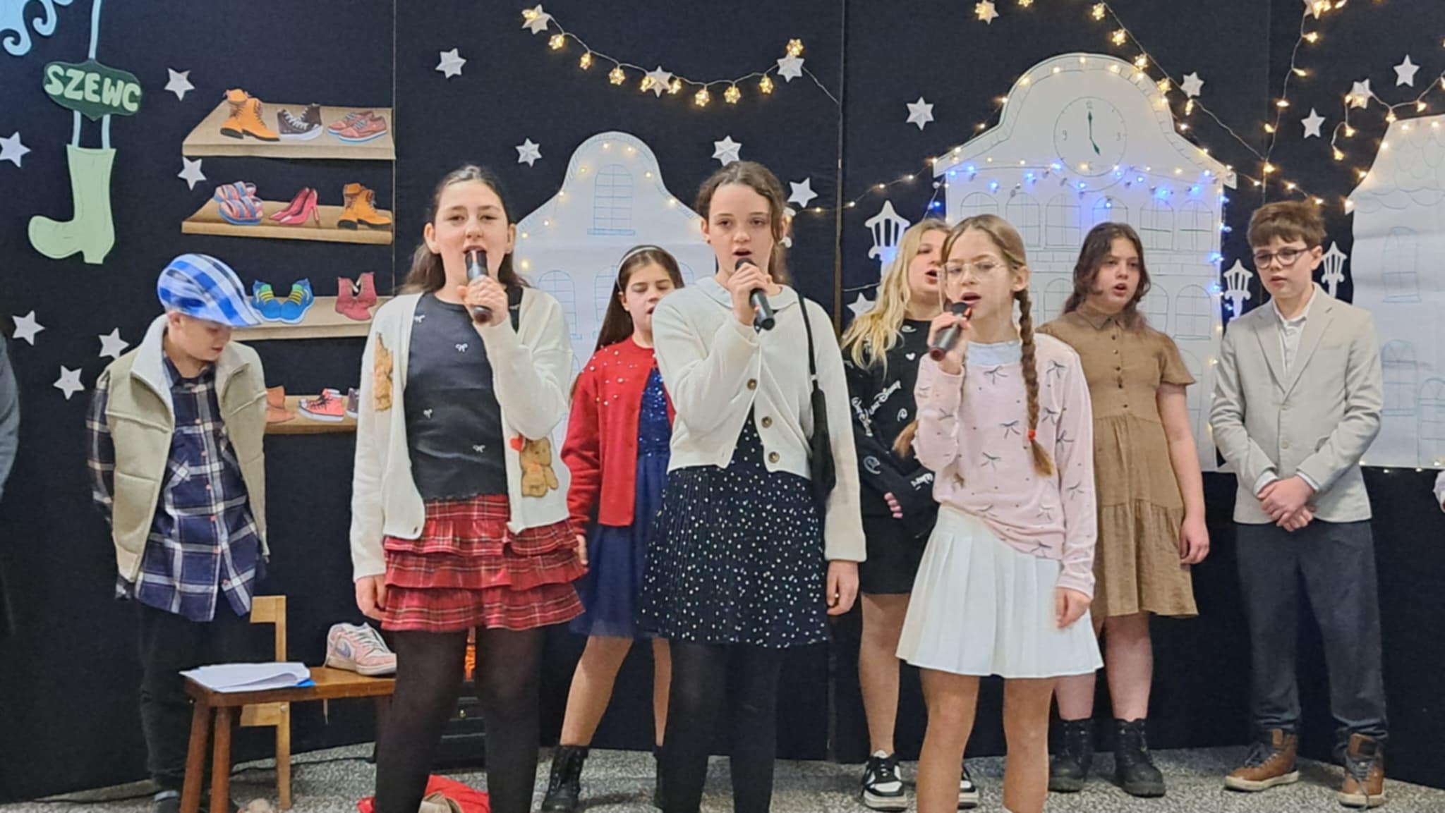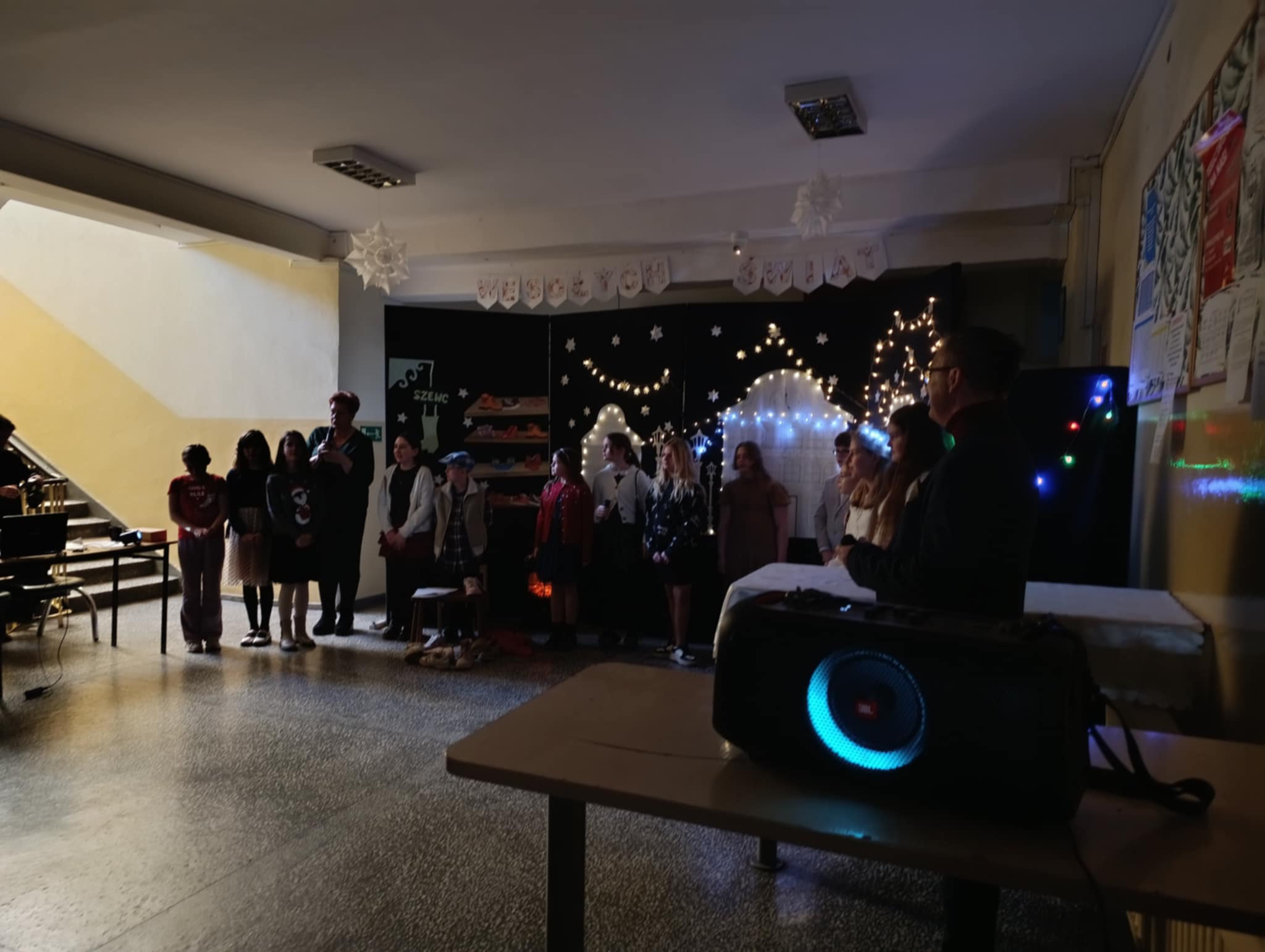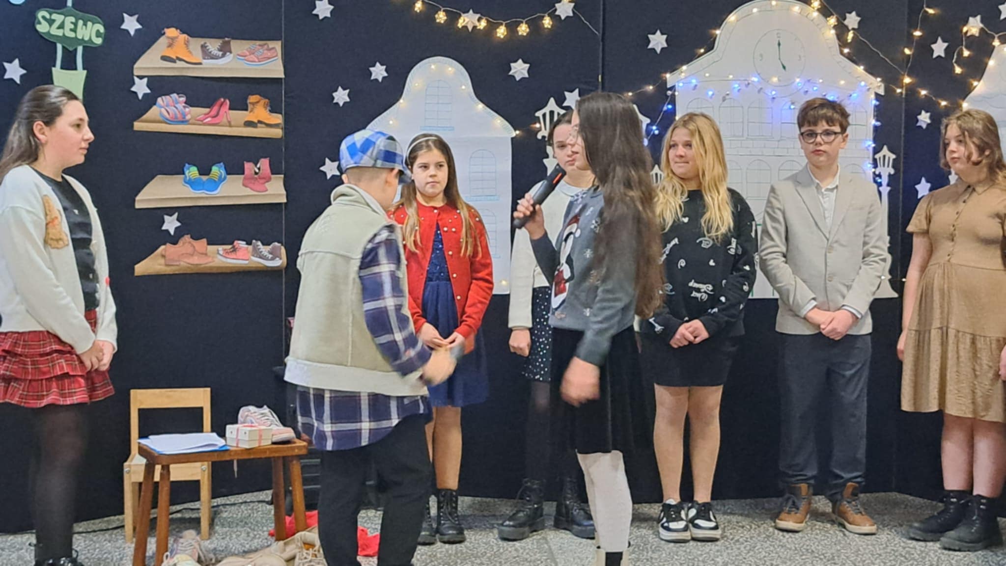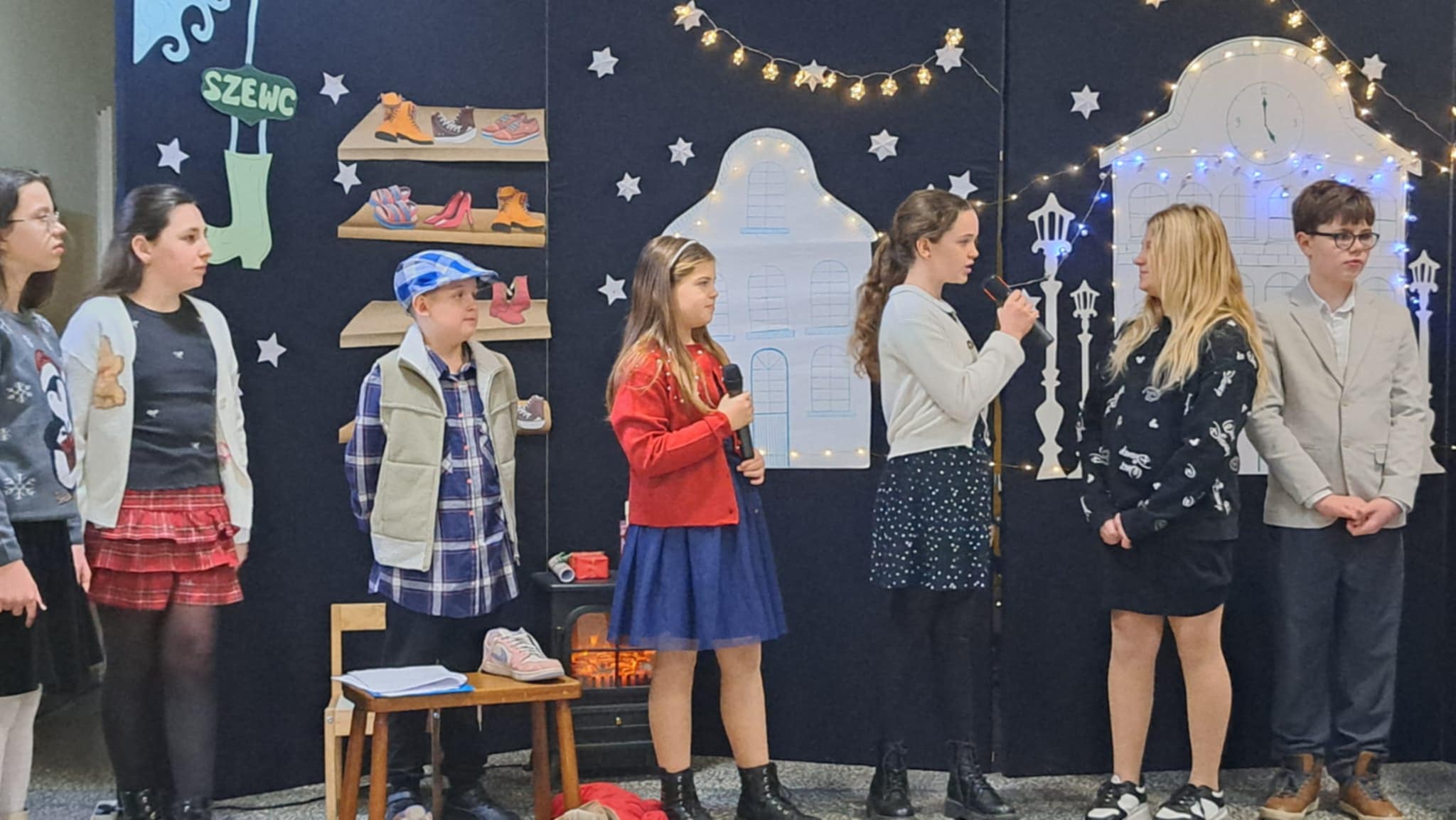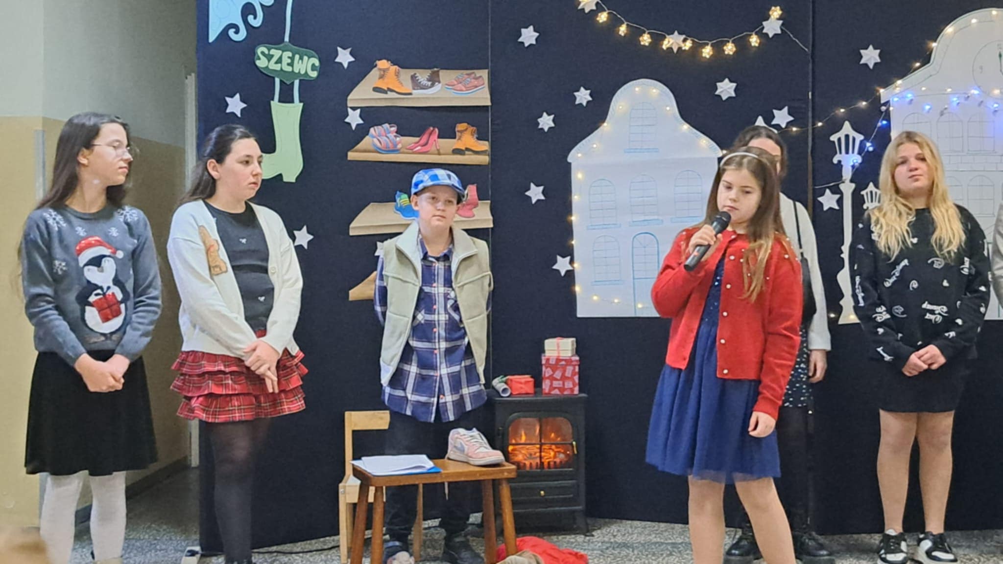 W piątek 19 grudnia wszyscy odświętnie ubrani zebraliśmy się na dolnym korytarzy, by obejrzeć spektakl teatralny wprowadzający w atmosferę Świąt Bożego Narodzenia. Aktorami byli uczniowie kl. V, a reżyserem wychowawczyni Pani Hanna Bartecka we współpracy z Panią Kasią Karczyńską. Przedstawienie było bardzo ciekawe i efektowne, wszystkim przypadło do gustu. Później wręczyliśmy nagrody i dyplomy z różnych konkursów. Były też oczywiście wspólne kolędy i życzenia świąteczne. Po zakończeniu tej części rozeszliśmy się do sal lekcyjnych, by wspólnie z wychowawcami świętować Boże Narodzenie. Wesołych Świąt!