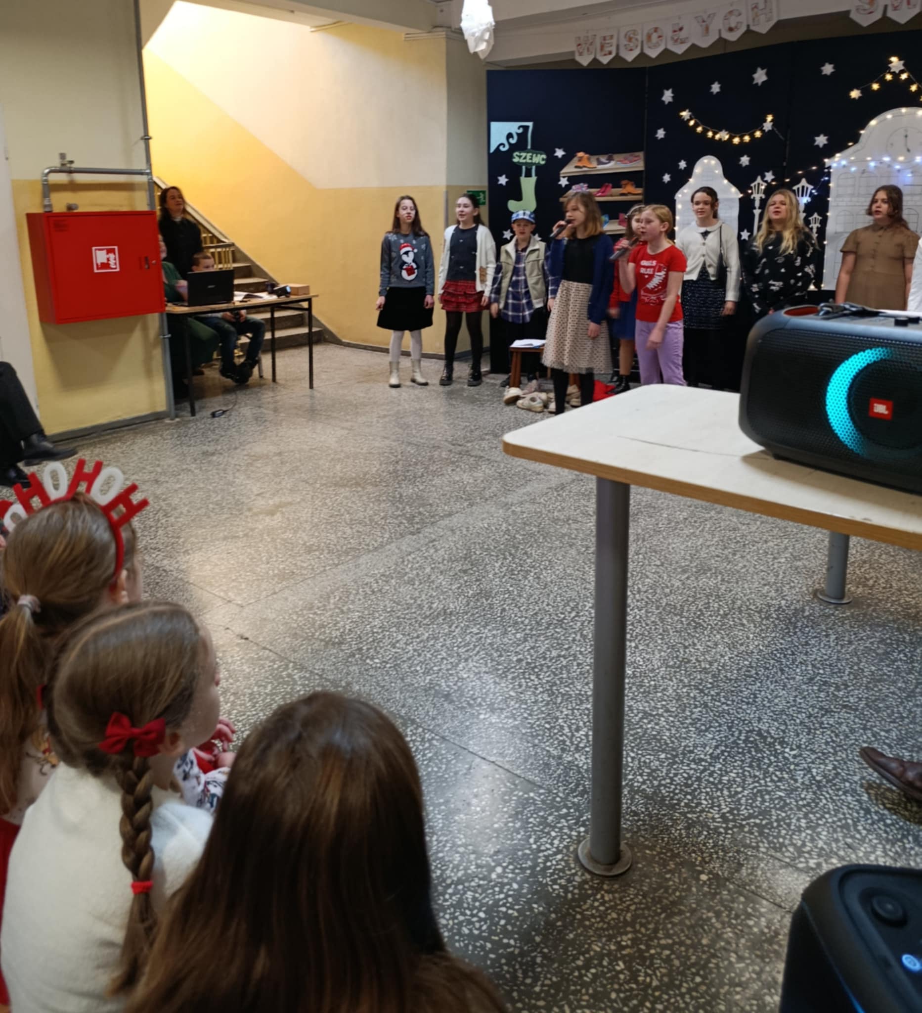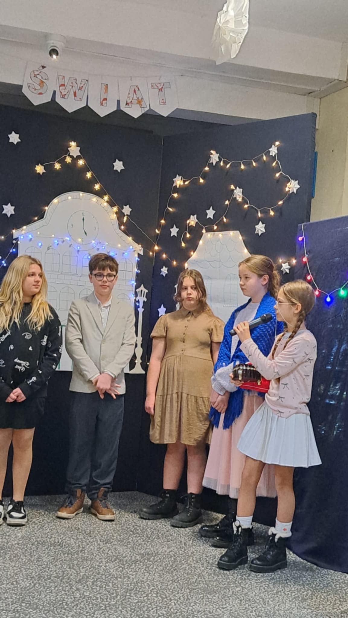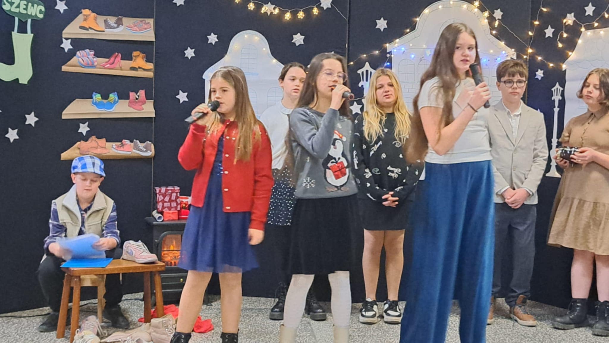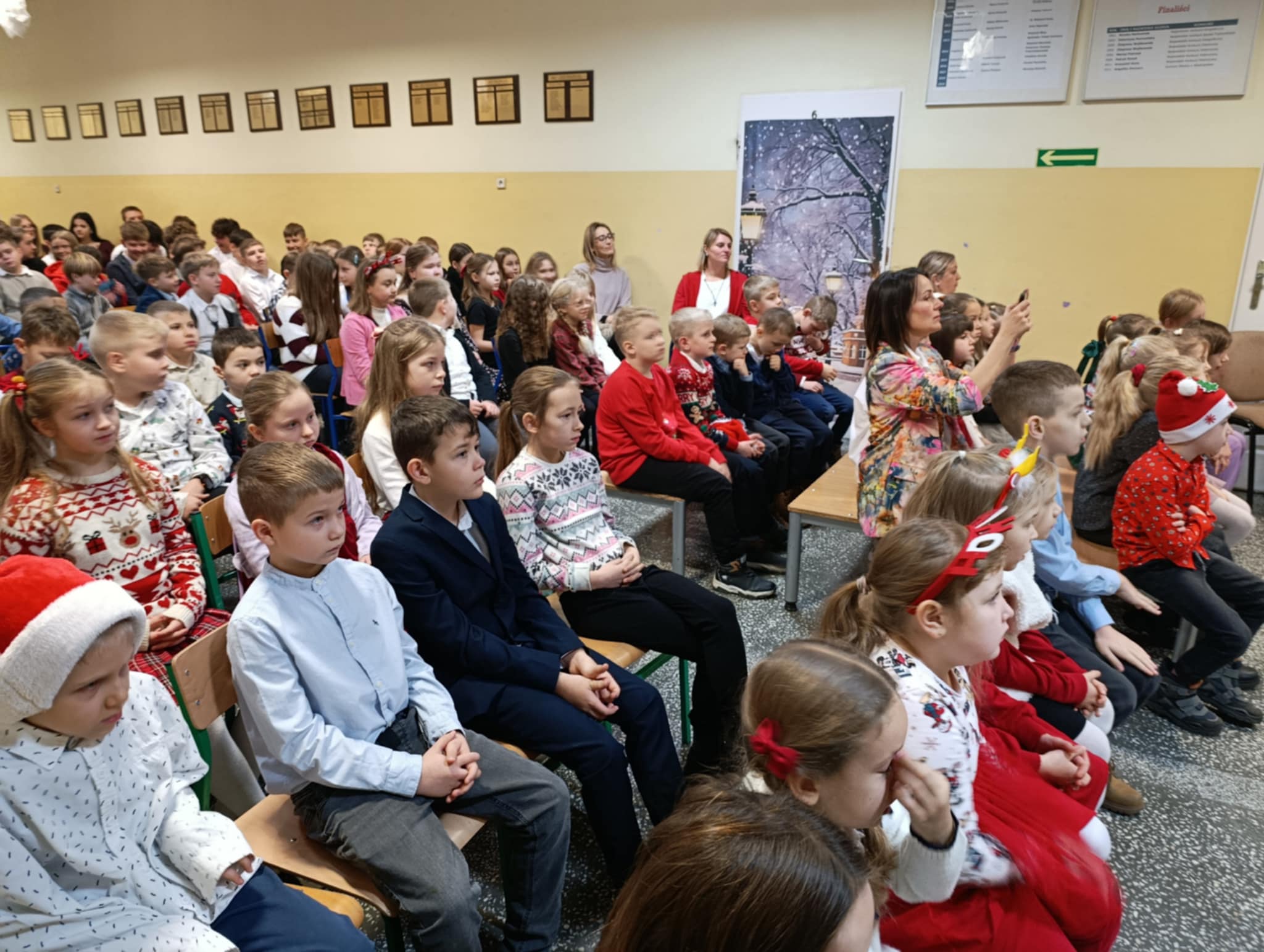 W piątek 19 grudnia wszyscy odświętnie ubrani zebraliśmy się na dolnym korytarzy, by obejrzeć spektakl teatralny wprowadzający w atmosferę Świąt Bożego Narodzenia. Aktorami byli uczniowie kl. V, a reżyserem wychowawczyni Pani Hanna Bartecka we współpracy z Panią Kasią Karczyńską. Przedstawienie było bardzo ciekawe i efektowne, wszystkim przypadło do gustu. Później wręczyliśmy nagrody i dyplomy z różnych konkursów. Były też oczywiście wspólne kolędy i życzenia świąteczne. Po zakończeniu tej części rozeszliśmy się do sal lekcyjnych, by wspólnie z wychowawcami świętować Boże Narodzenie. Wesołych Świąt!