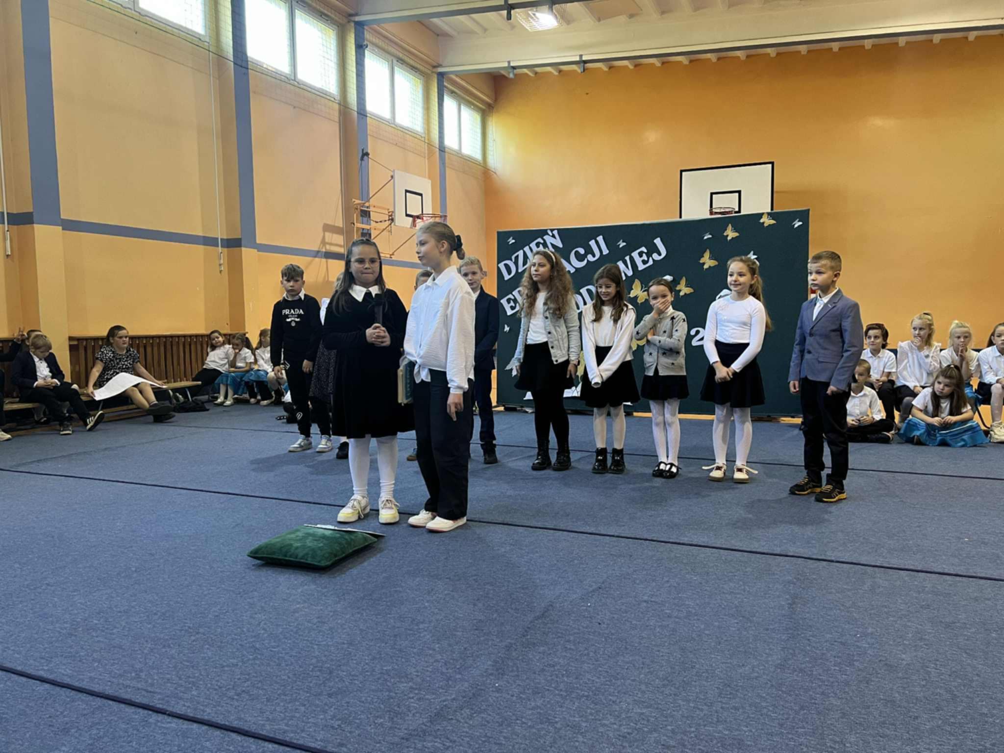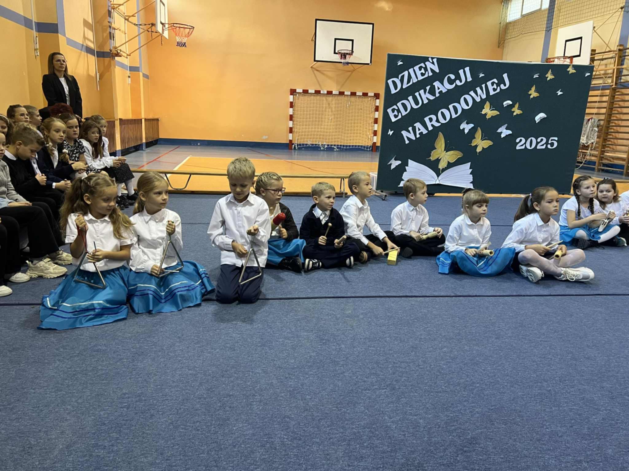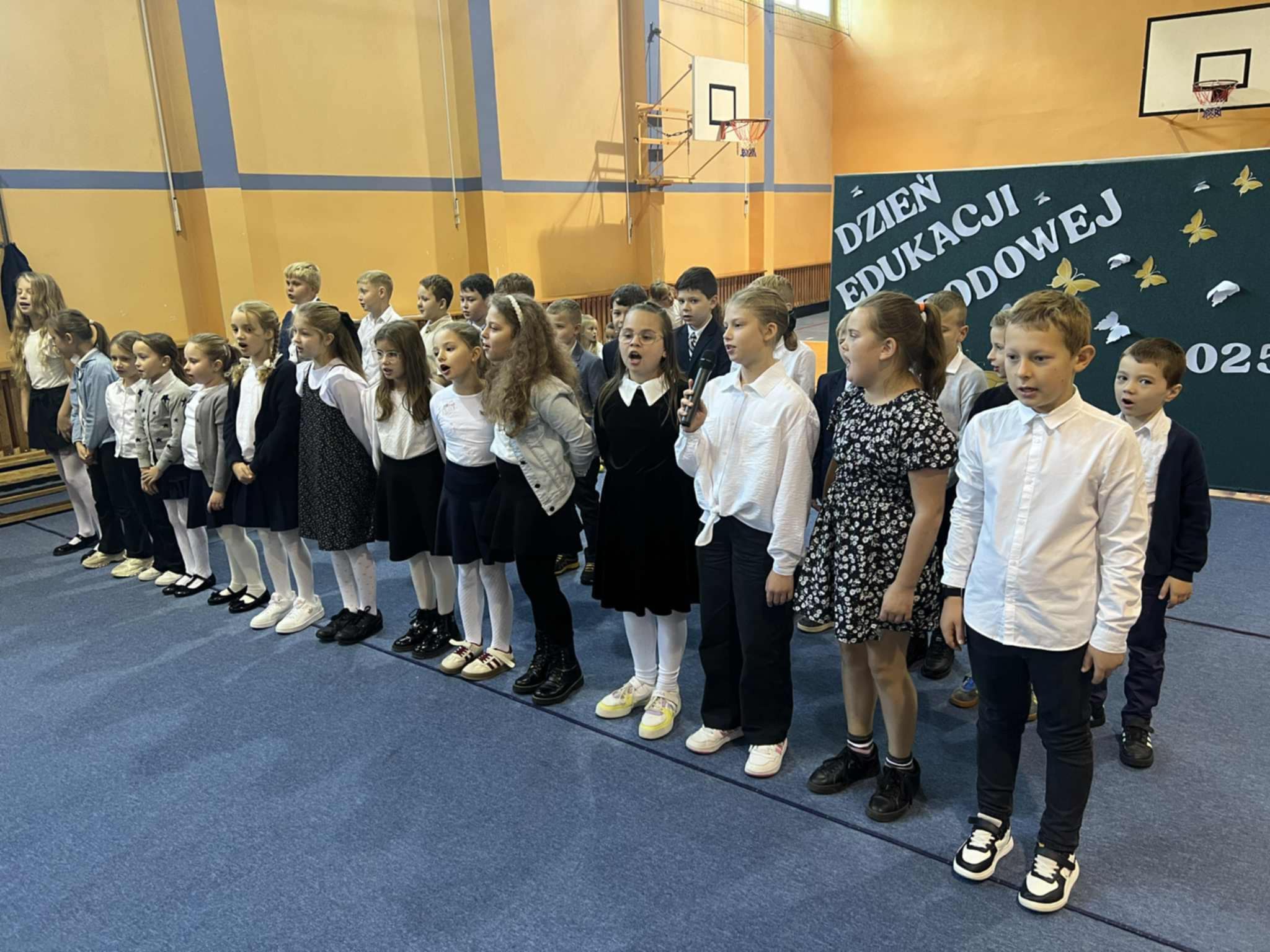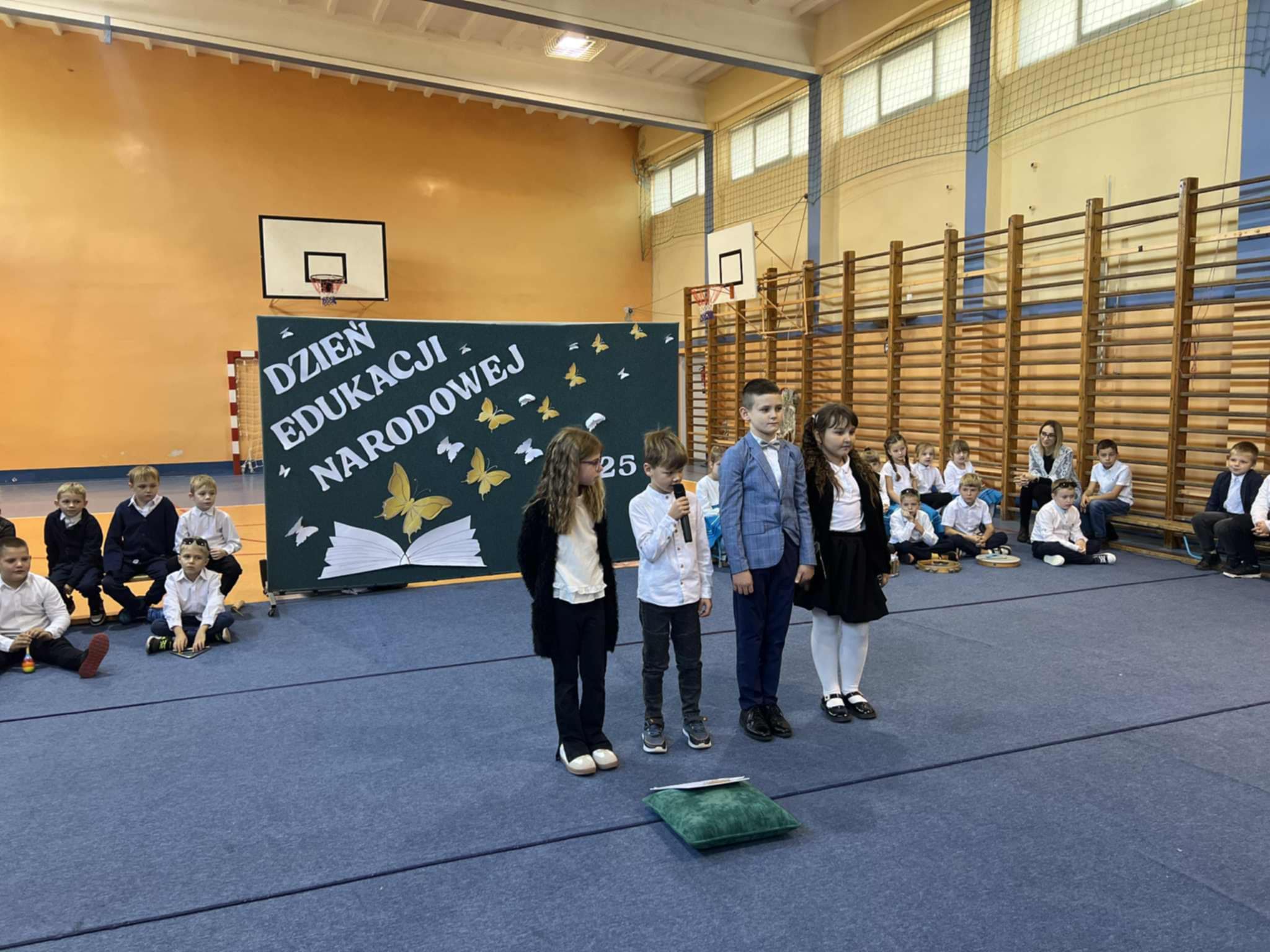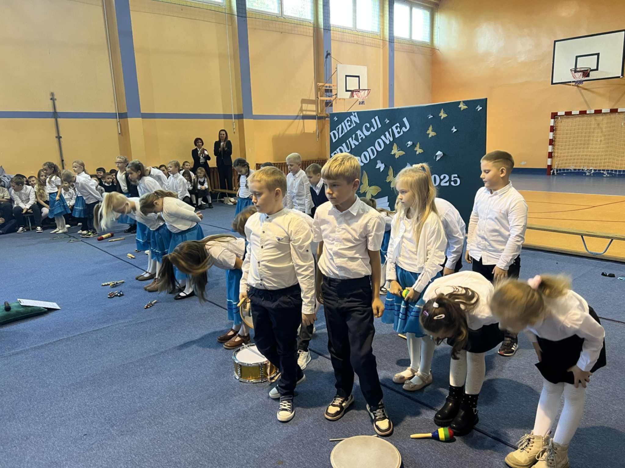 W poniedziałkowy poranek uczniowie z kl. I - III zaprosili wszystkich nauczycieli i pracowników szkoły na uroczystość z okazji Dnia Edukacji Narodowej. Obejrzeliśmy piękny, humorystyczny montaż, w którym były popisy taneczne, wokalne i aktorskie. Ba, była nawet orkiestra z prawdziwą dyrygentką!