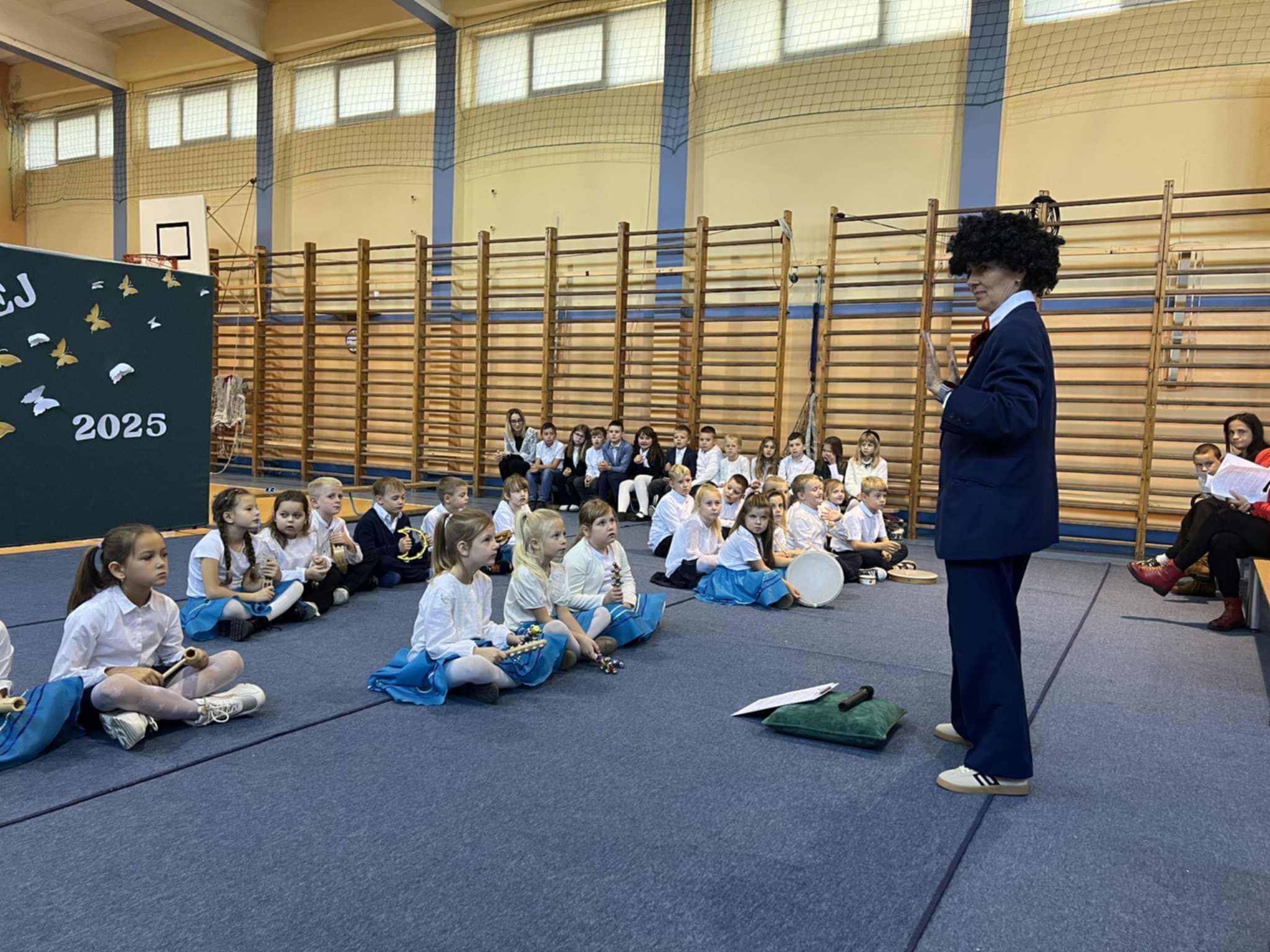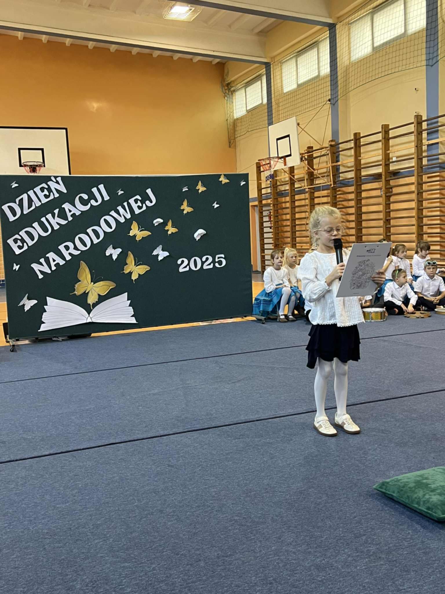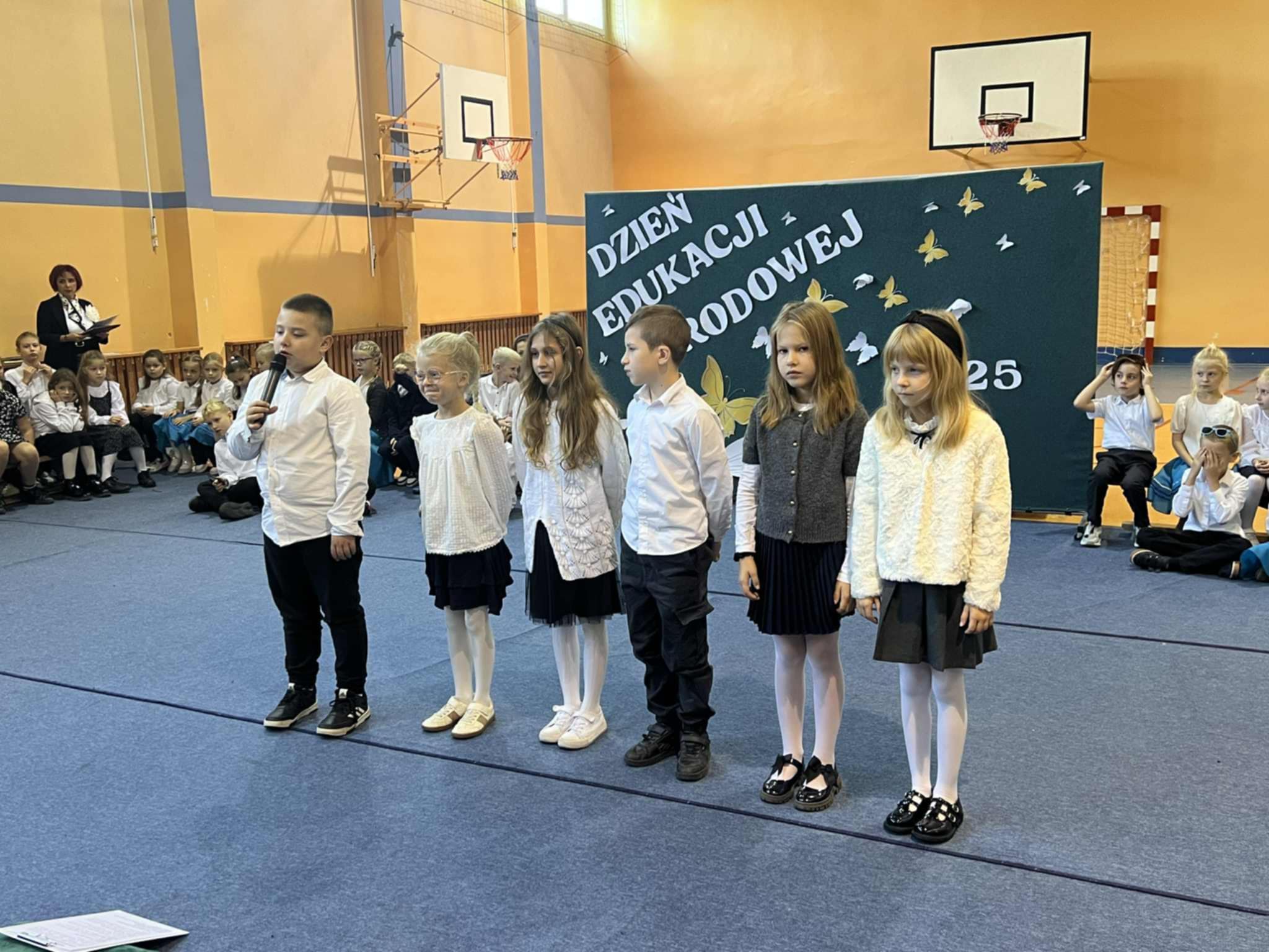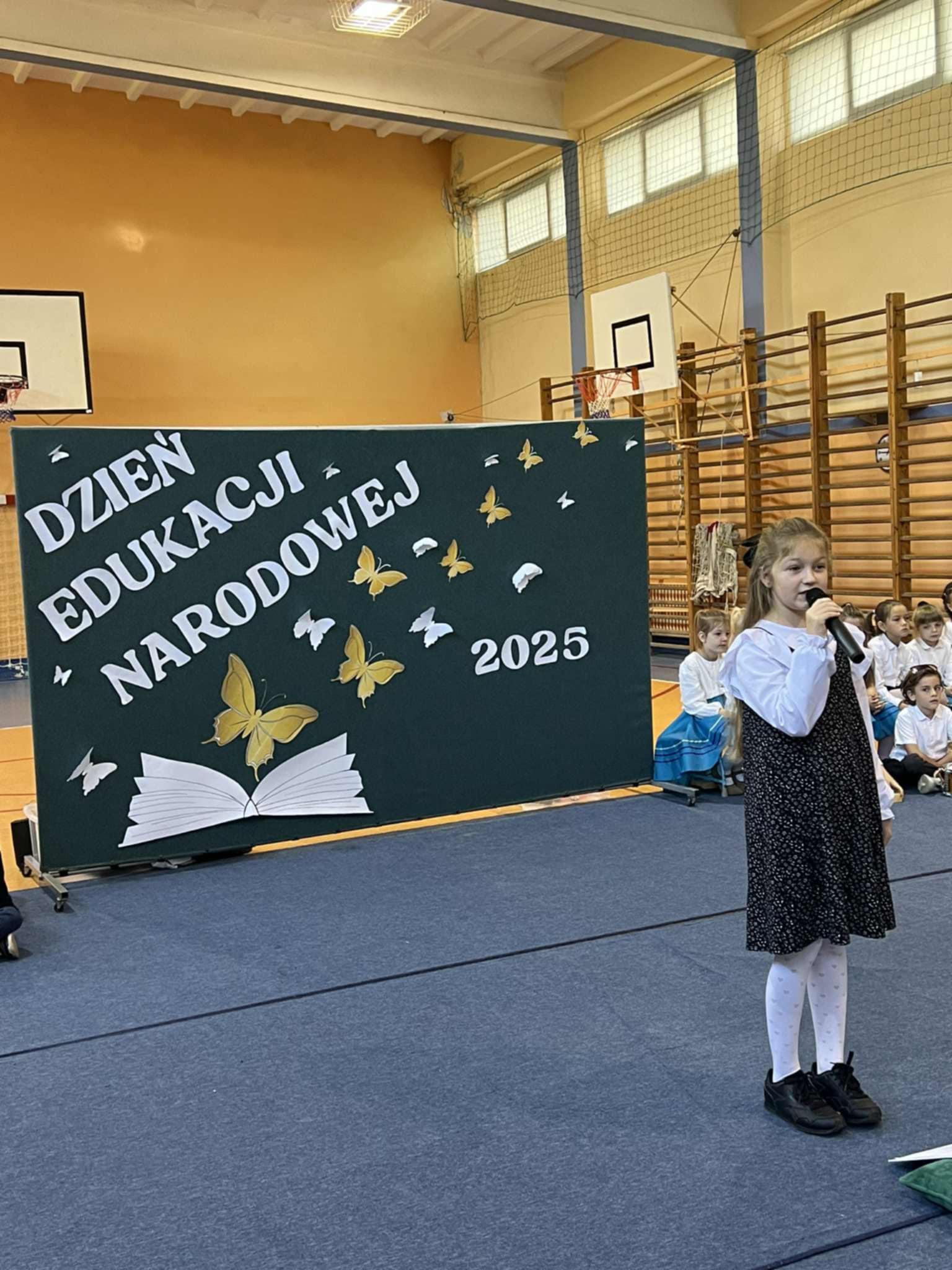 W poniedziałkowy poranek uczniowie z kl. I - III zaprosili wszystkich nauczycieli i pracowników szkoły na uroczystość z okazji Dnia Edukacji Narodowej. Obejrzeliśmy piękny, humorystyczny montaż, w którym były popisy taneczne, wokalne i aktorskie. Ba, była nawet orkiestra z prawdziwą dyrygentką!